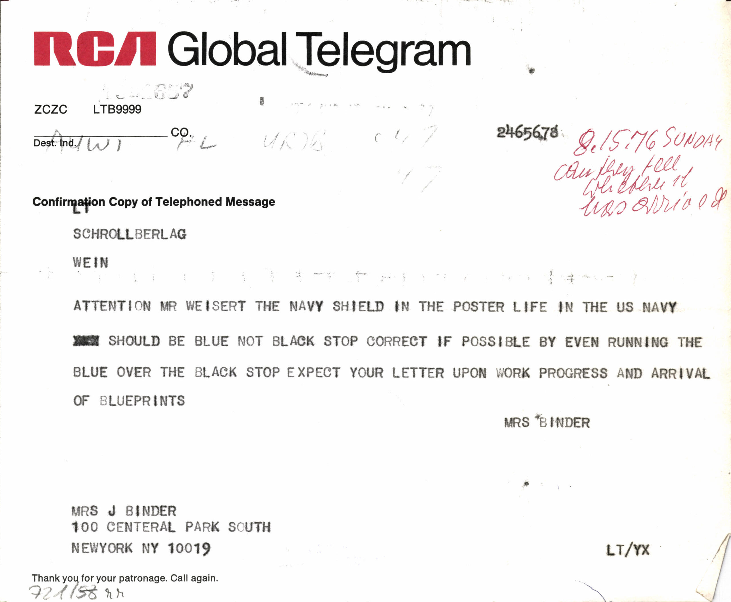 - sender: Carla Binder, New York City, 1976