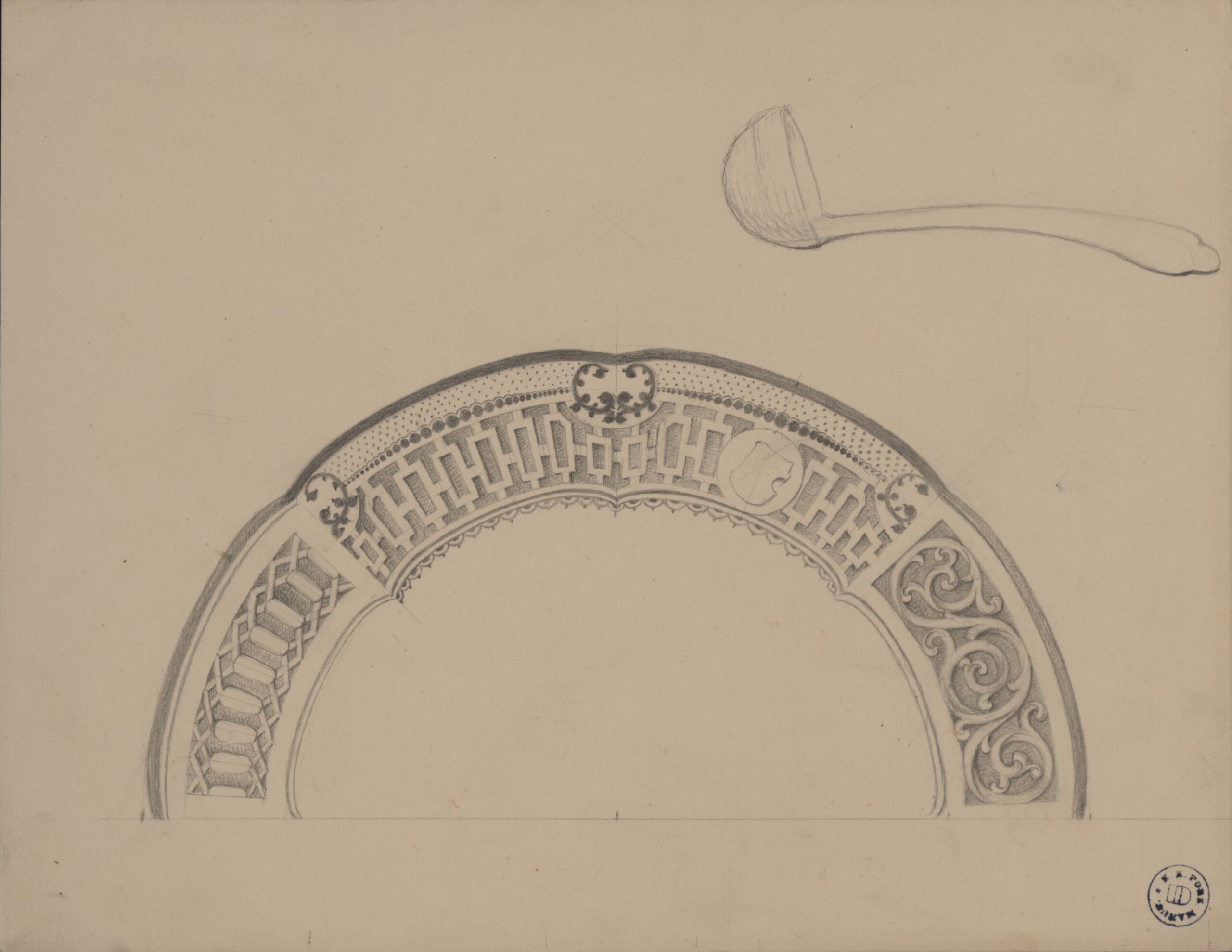 Teller (halbe Form abgebildet) mit leicht gewelltem Rand, Fahne mit drei Dekorvariationen (geometrischer und stilisierter Rankendekor, Wappenkartusche); oberhalb Darstellung einer Schlöpfkelle