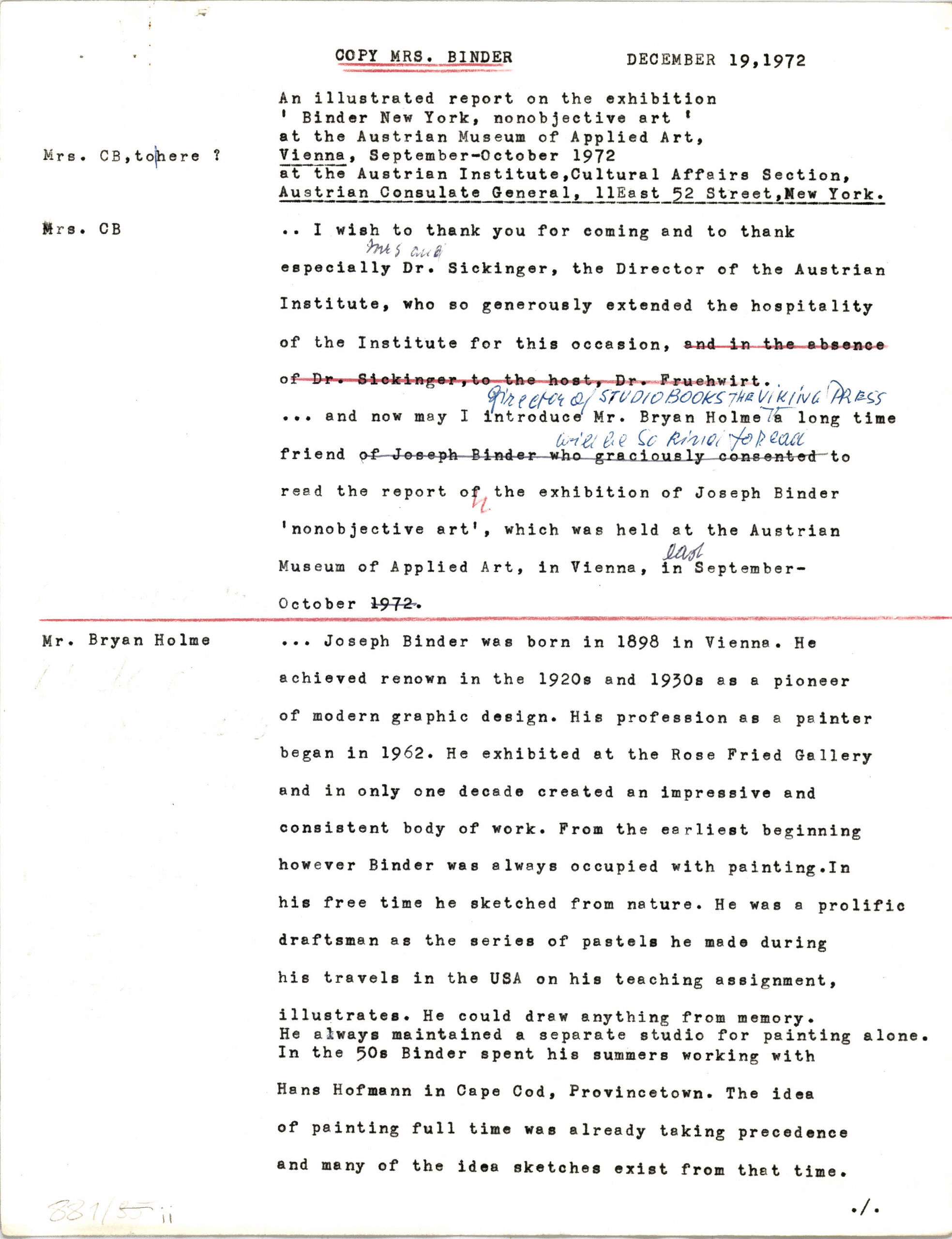 design, Text des Vortrages über die Ausstellung "Joseph Binder. Nonobjective Art" im Österreichischen Museum für angewandte Kunst, MAK vom 15.9. bis 29.10.1972 im Austrian Institute am 19.12.1972, Carla Binder, MAK Inv.nr. KI 14145-881-35-2