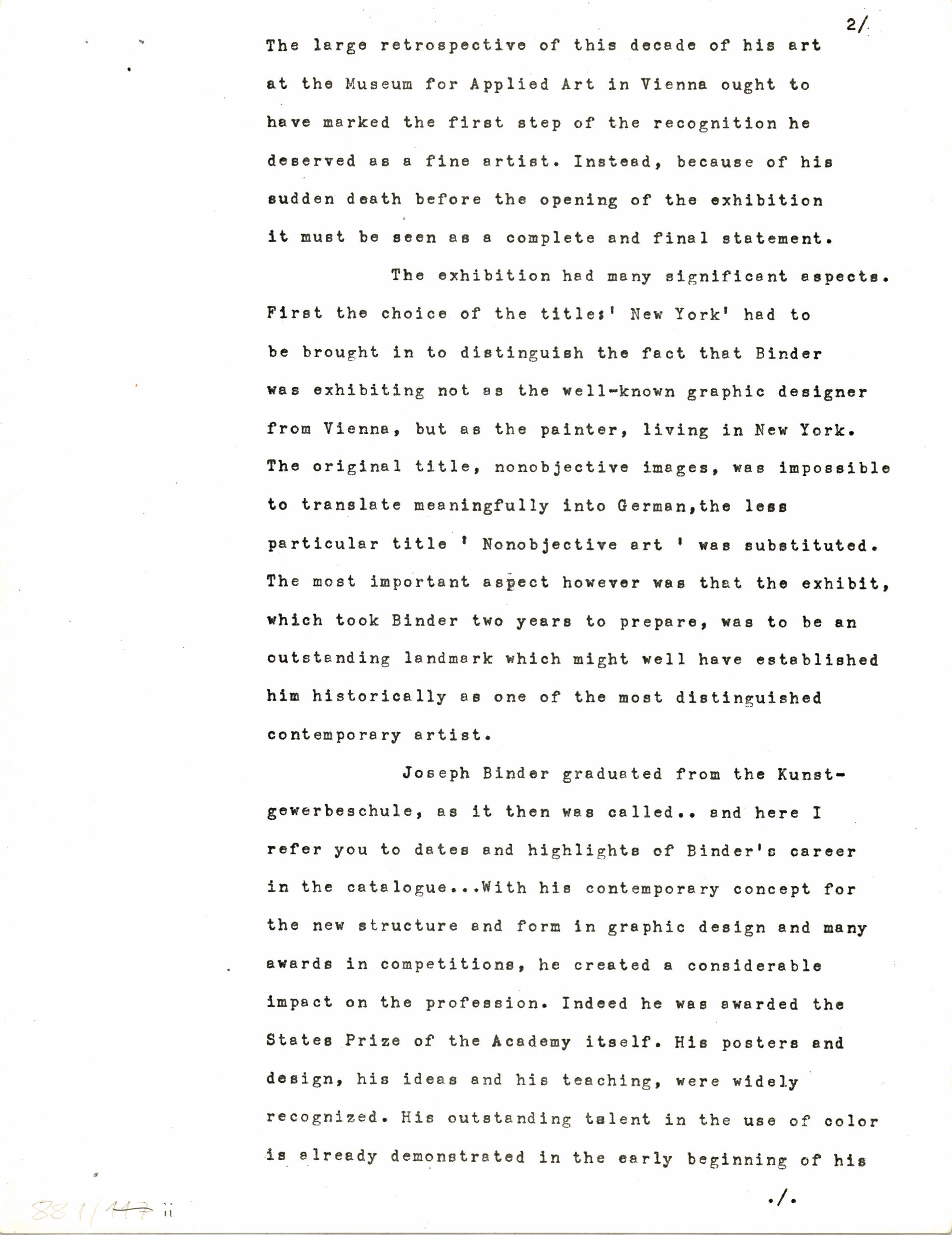 - Text des Vortrages über die Ausstellung "Joseph Binder. Nonobjective Art" im Österreichischen Museum für angewandte Kunst, MAK vom 15.9. bis 29.10.1972 im Austrian Institute am 19.12.1972 (given title)