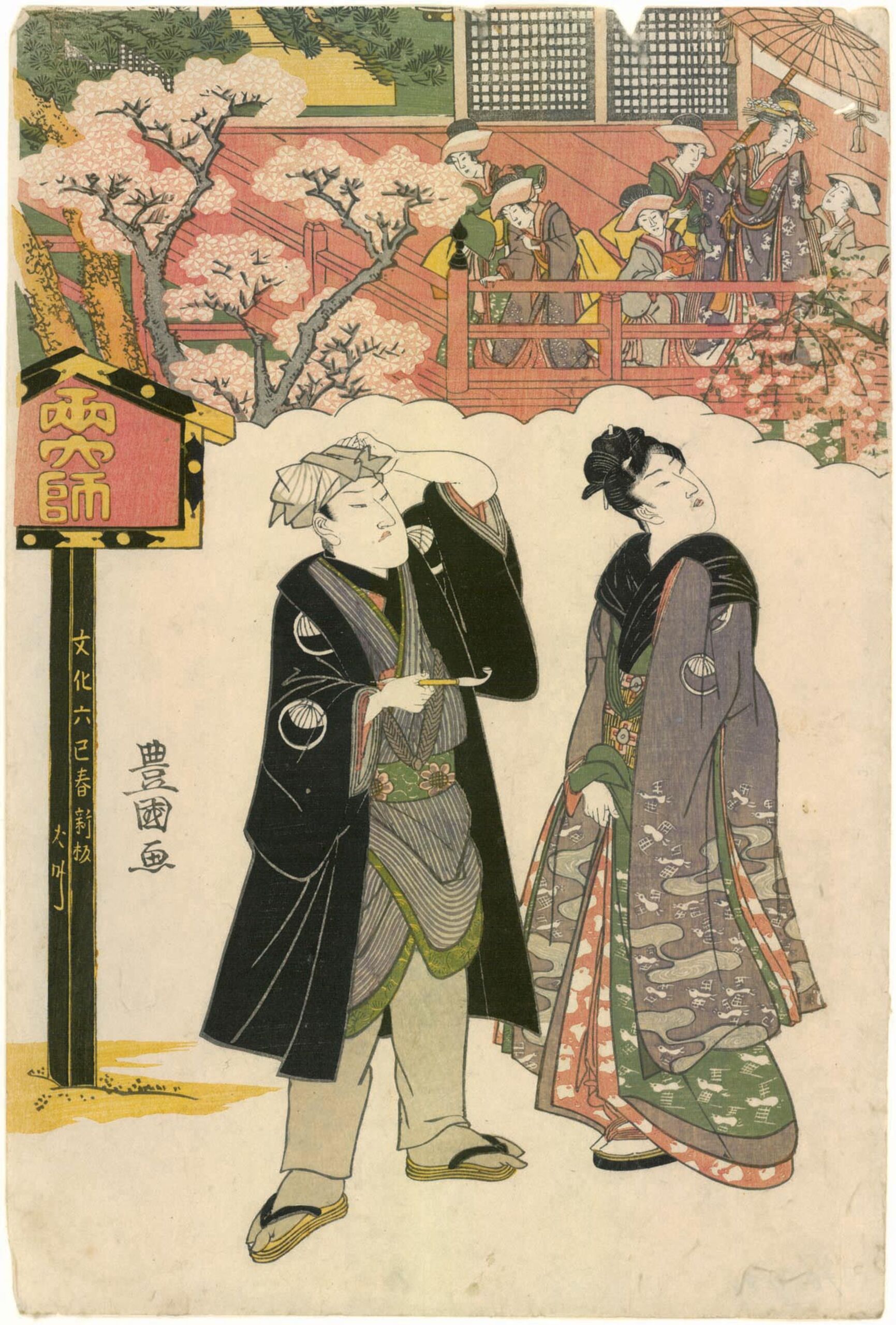 Zu sehen sind hier die Schauspieler Sawamura Gen'nosuke I. 初代澤村源之助 (= Sawamura Sōjūrō IV. 四代目澤村宗十郎) und Sawamura Tanosuke II. 二代目澤村田之助. Links eine Tafel mit dem Aufschrift „Ryōdaishi 両大師“. Auf dem Pfosten der Tafel: „Bunka 6 mi haru shinban 文化六巳春新板“ = Neue Auflage im Frühling 1809, Jahr der Schlange. Im Hintergrund die Veranda der Kiyomizu-Halle zwischen blühenden Kirschbäumen. Eine prächtig gekleidete Frau und ihre Dienerinnen genießen den Ausblick.