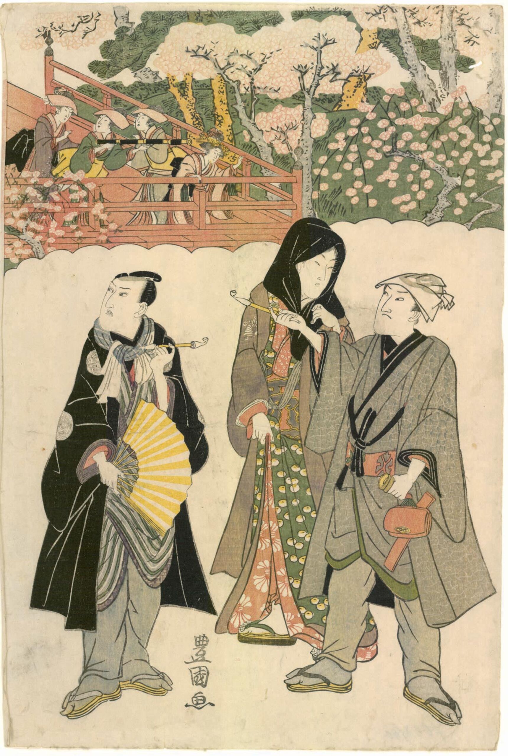 Serie mit Triptychen, die Kabuki-Schauspieler bei verschiedenen Vergnügungen in den 12 Monaten zeigen. Ausflug zur Kiyomizu-Halle 清水観音堂 des Kan‘ei-Tempels 寛永寺 in Ueno im 3. Monat. Im Vordergrund die Schauspieler (von links) Ichikawa Danjūrō VII. 七代目市川團十郎 mit Fächer, der on'nagata 女形・女方-Darsteller Segawa Kikunojō IV. 四代目瀬川菊之丞 und Onoe Eisaburō I. 初代尾上榮三郎 (= Onoe Kikugorō III. 三代目尾上菊五郎). Im Hintergrund drei Frauen und ein Mädchen auf der Veranda der Kiyomizu-Halle. Die Frauen haben ein Fernrohr in der Hand.