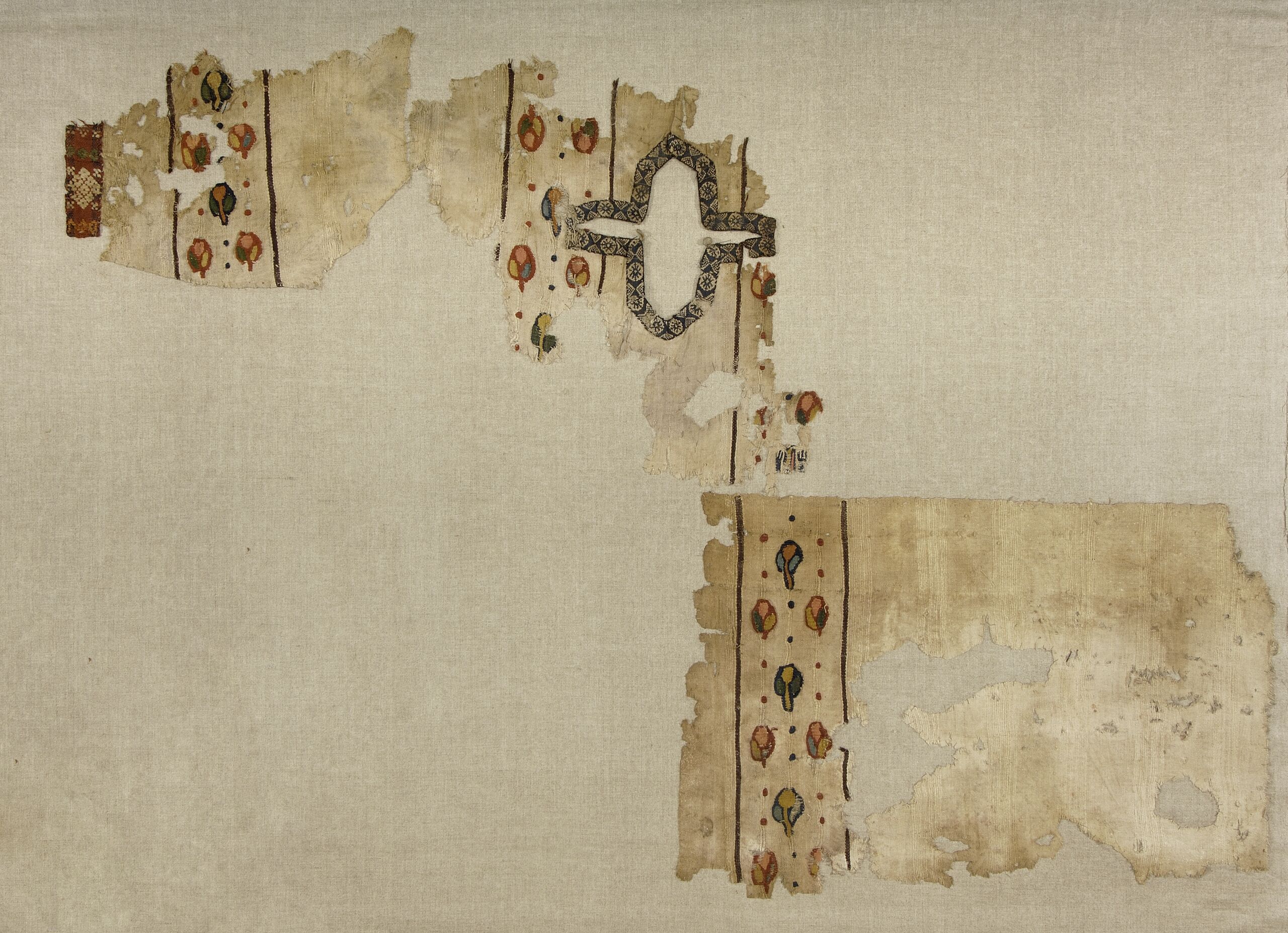 - Three fragments of a child’s tunic with two decorative bands (clavi) and horizontal tuck, a sleeve band and a bordering sleeve and neck band; pattern of leaves and dots (composition incorrect) (descriptive title)