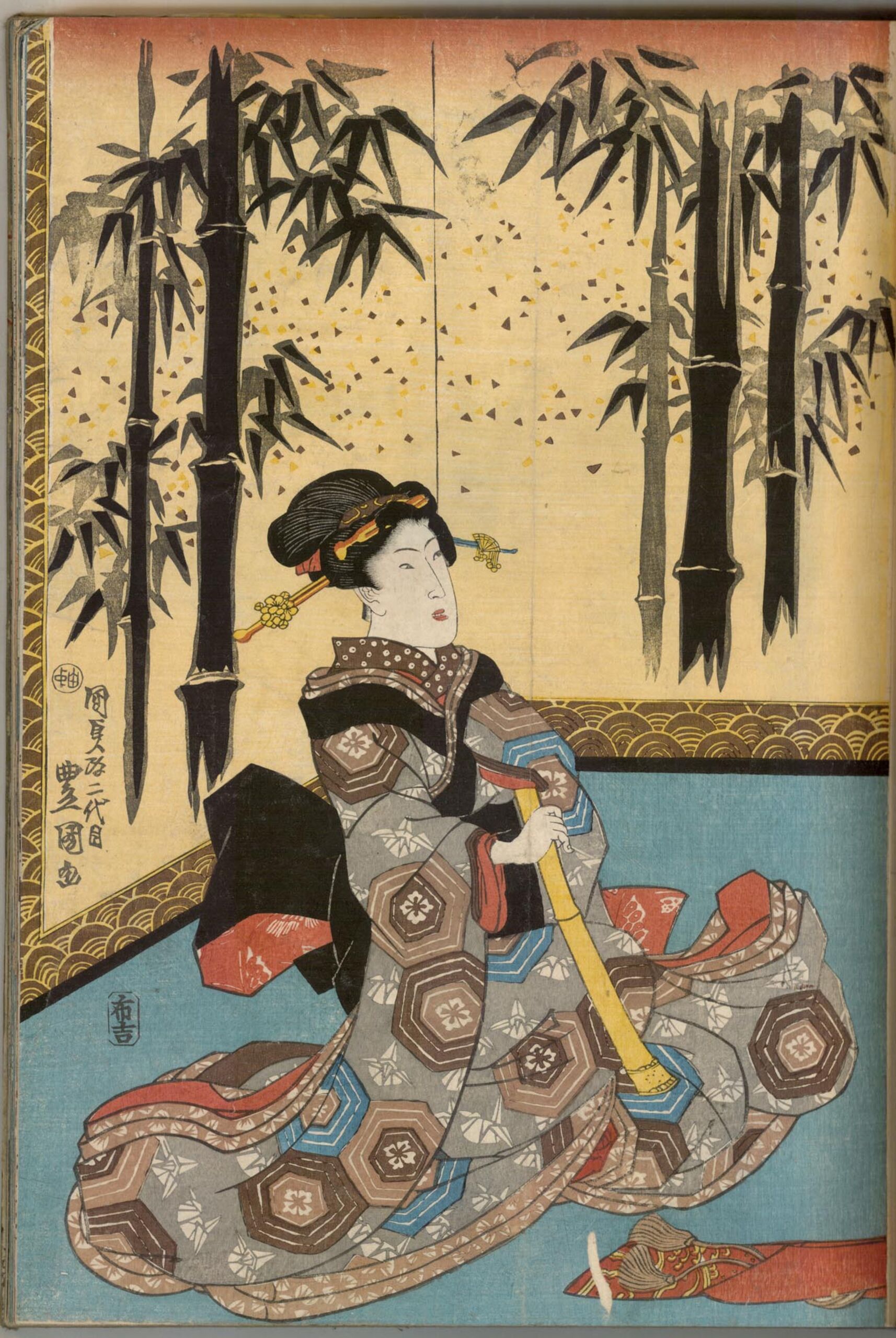 Drei musizierende Frauen vor einem Wandschirm mit Bambus-Bemalung. Die Frau hier hält eine shakuhachi 尺八 (Bambusflöte). Ihr Kimono ist mit Blumenmotiven und origami-Kranichen (ori-zuru) verziert.