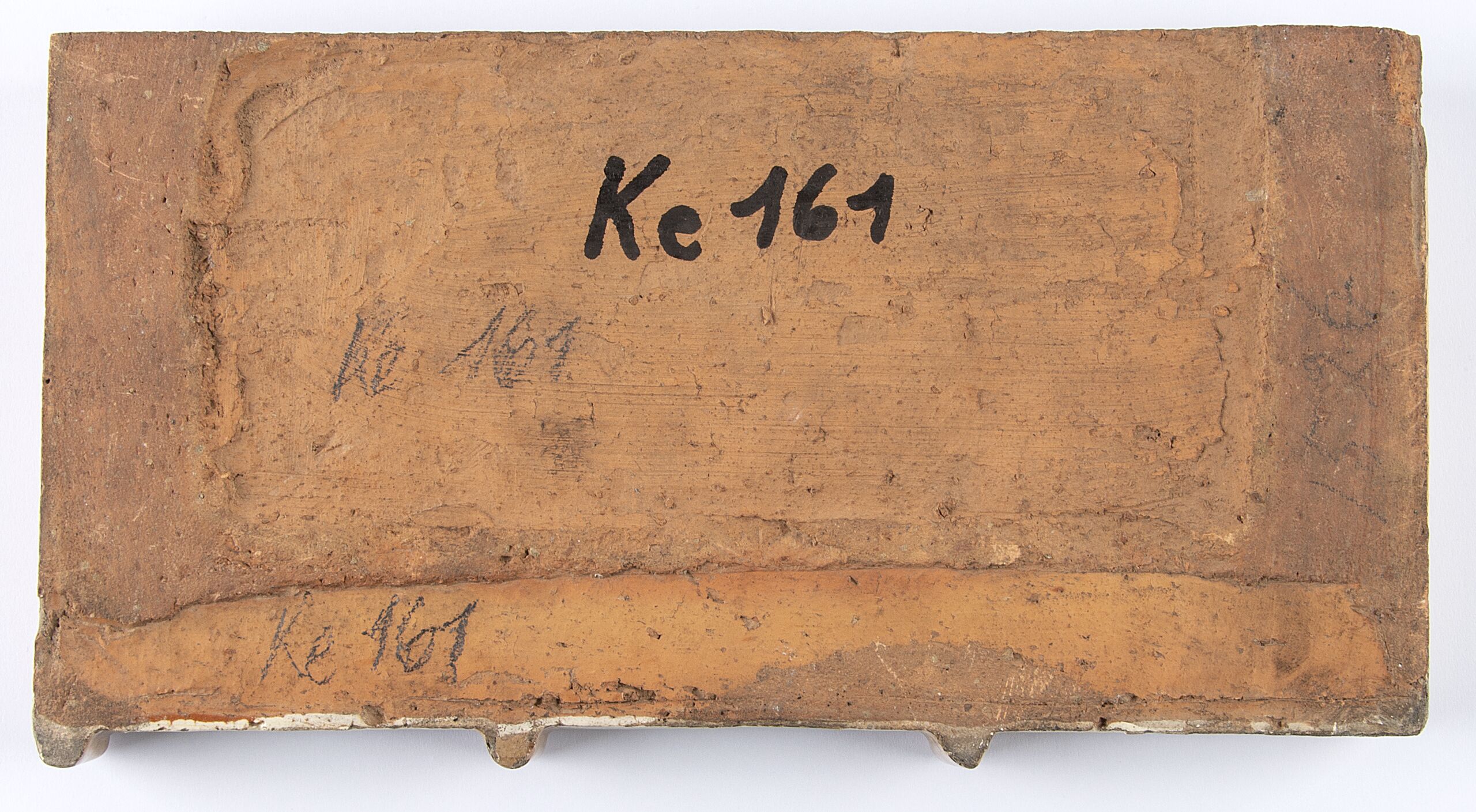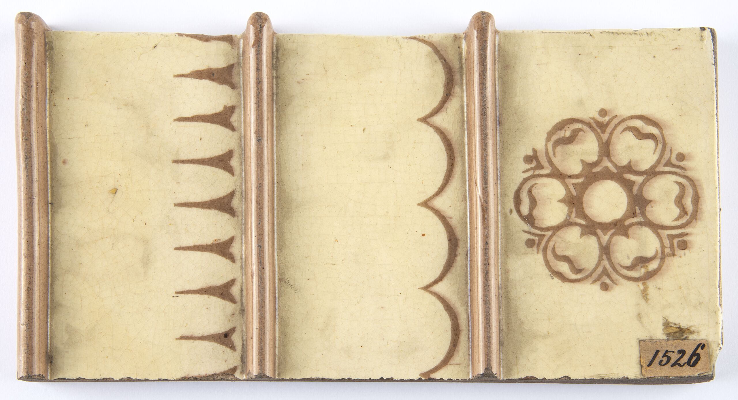 Hochrechteckige Kachel mir 3 Wülsten, beiger Grund, hellbraunes Design, oberer Reihe Blume, Mittlere Rundbogen, untere zapfenförmig