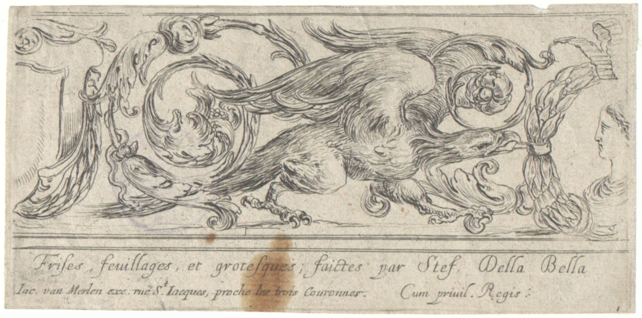 - text on object: Frises, feuillages et grotesques; faistes par Stef. Della Bella / Iac. van Merlen exc. rue St. Iacques, proche les trois Couronnes. Com privil. Regis. / 1