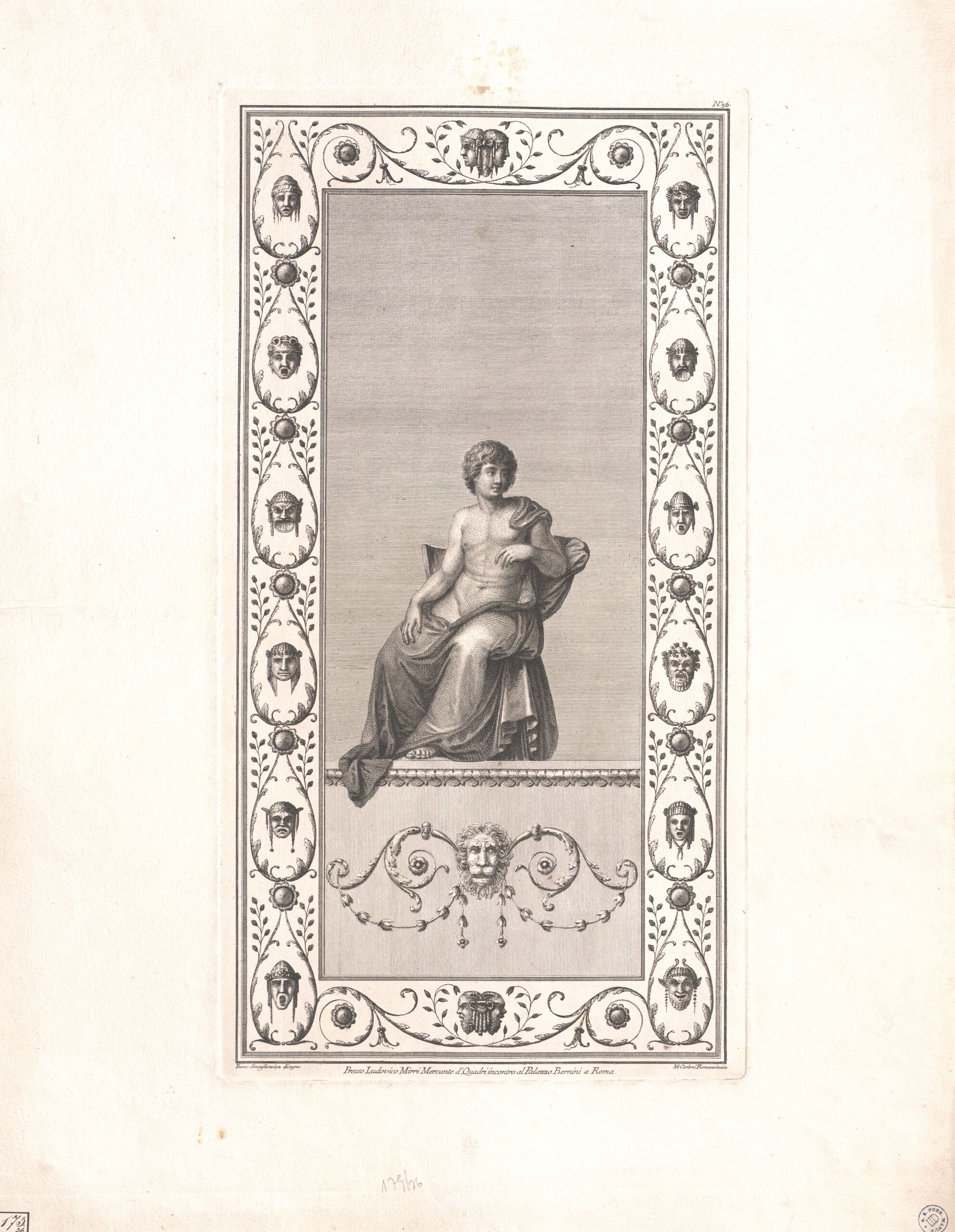 - text on object: No. 36 / Franc. Smugliewicz disegno / M. Carloni Romano incise / Presso Ludovico Mirri Mercante de Quadri incontro al Palazzo Bernini a Roma