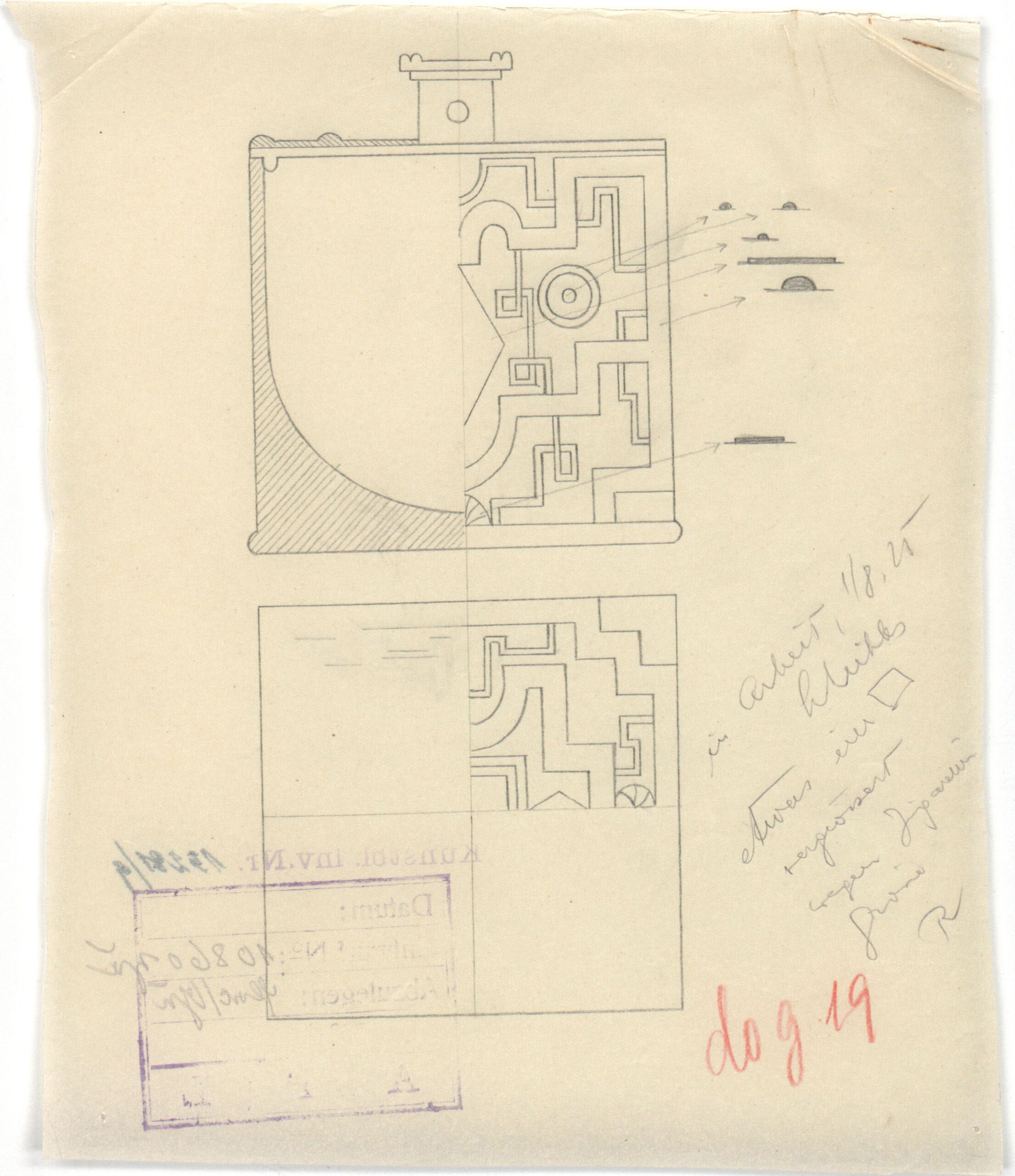 - text on object: in Arbeit, 1. 8. 25/Parapheetwas um (ein Quadrat, ca 5 mm, Anm.LJ)/vergrössert/wegen Zigaretten/Grösse/Paraphe