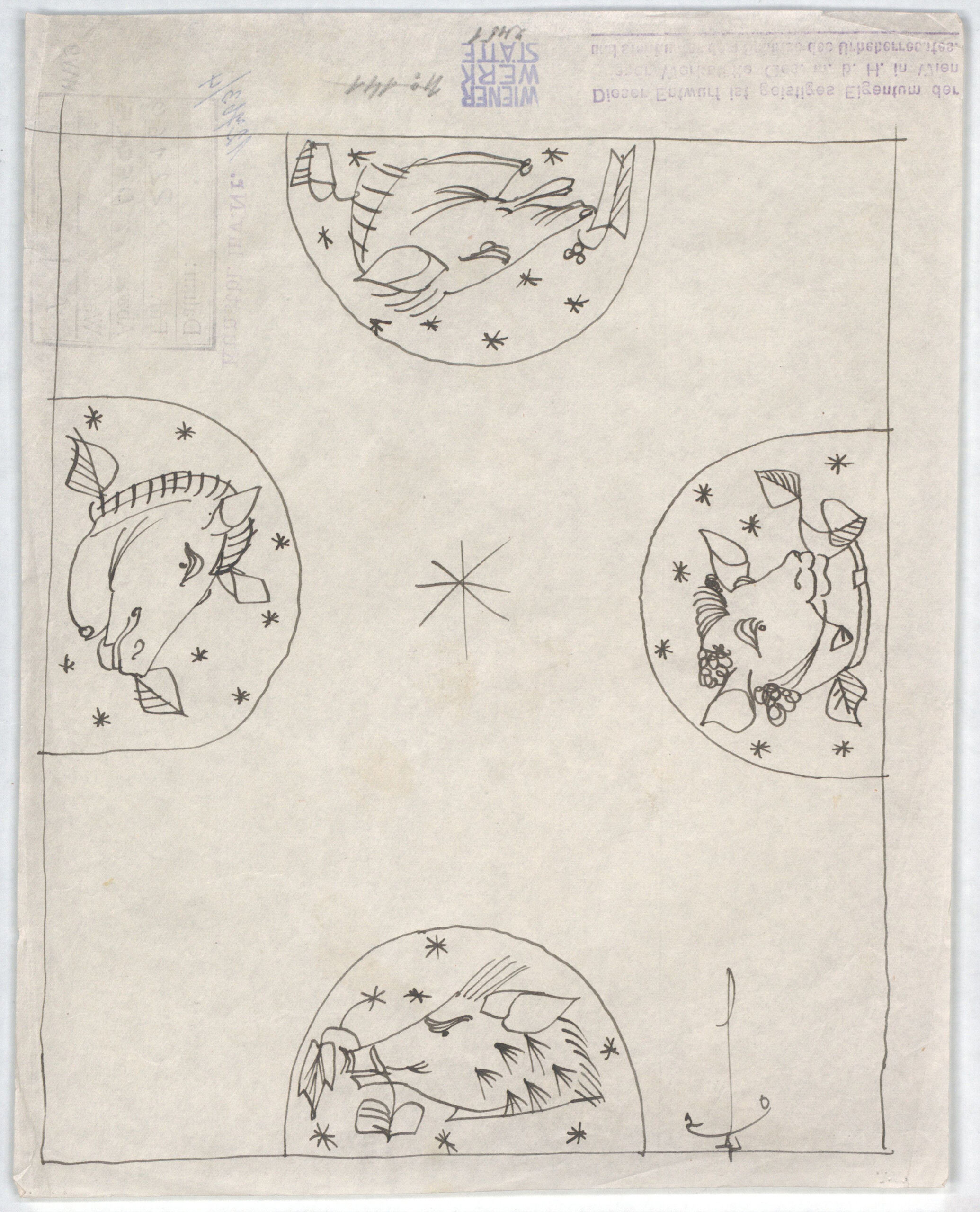 - WW Stempel: Dieser Entwurf ist geistiges Eigentum der Wiener Werkstätte Ges.m.b.H. in Wien und steht unter dem Schutze des Urheberrechtes (verso)