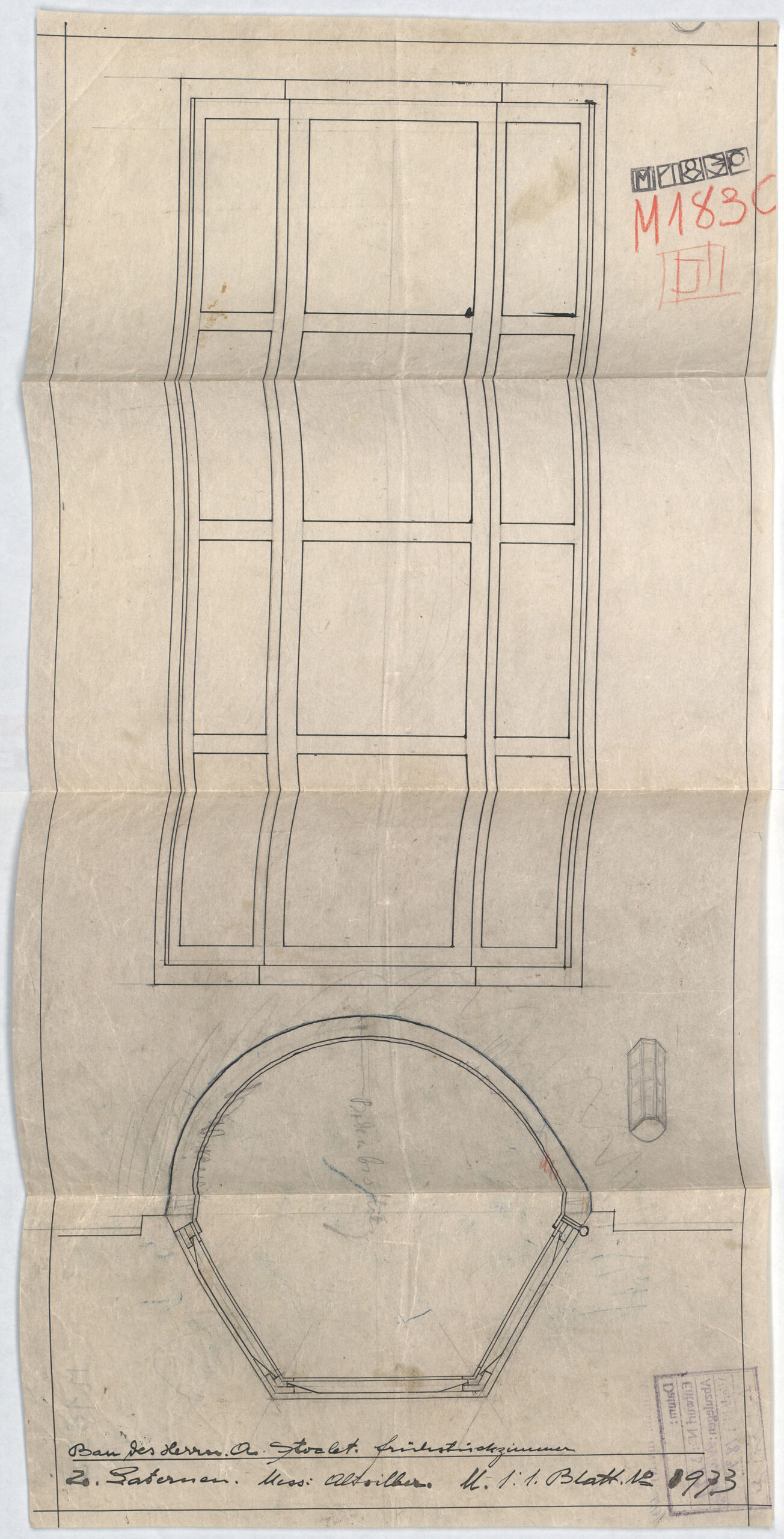 - text on object: Bau des Herrn A. Stoclet. Frühstückzimmer2 Laternen. Mess: Altsilber. M. 1:1 Blatt No 973Boden bis Holz