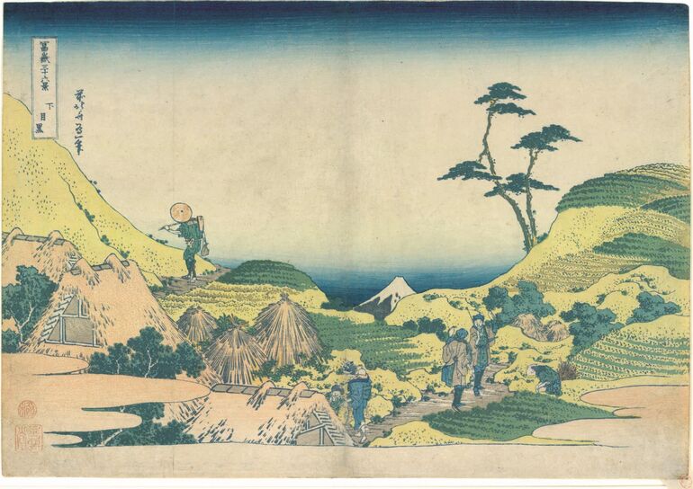 Blatt 01. Kaum ein anderer japanischer Farbholzschnitt ist so berühmt wie „Die Welle“. Sie wurde sogar zum Symbol für die japanische Kunst überhaupt. Nicht das eigentliche Thema – die Bedrohung des Menschen durch die Naturgewalten – fasziniert, sondern vielmehr die naturalistische Darstellung eines Wellenberges, wie ihn die westliche Kunst bis dahin nicht gesehen hatte. Es ist jener kurze Bruchteil einer Sekunde festgehalten, bevor die gewaltigen Wassermassen in sich zusammenbrechen und die herannahende Katastrophe erahnbar wird. Wie ein Monster mit vielfingriger Hand scheint sich die Welle auf ihre Opfer zu stürzen. Die Dämonisierung der Natur und ihre Gewalt über den Menschen wird von Hokusai deutlich angesprochen. Bravourös versteht es der Künstler die verschiedenen Blautöne einzusetzen, um dem Element Wasser gerecht zu werden. Das Thema selbst jedoch ist in seinem Werk nicht neu: Schon vor dem Jahr 1800 zeigen einige seiner Arbeiten Wellenmotive, um dann schließlich kurz nach der Jahrhundertwende – 1800–1805 – in zwei Holzschnitten zu jenem hohen, bedrohlichen Wellenberg zu werden. Diese beiden Farbholzschnitte stammen aus einer relativ kurzen Schaffensphase Hokusais, in der er sich europäisch beeinflusster Stilelemente bediente. Diesen Wellenbergen fehlt allerdings der dämonisierende Charakter. Sie sind stilisiert und scheinen unbeweglich wie feste Berge. In der dynamischen Darstellung der „Welle“ greift Hokusai in der japanischen Kunstgeschichte weit zurück. Ab 1630 bildete sich rund um die Sotatsu-Koetsu-Schule in Kyoto eine Neubelebung der japanischen Malerei aus, wobei Stilelemente aus der realistischen Tuschemalerei Chinas aufgenommen wurden. Dieser stilistische Konservativismus wird für die späte Schaffensperiode Hokusais von wachsender Bedeutung.