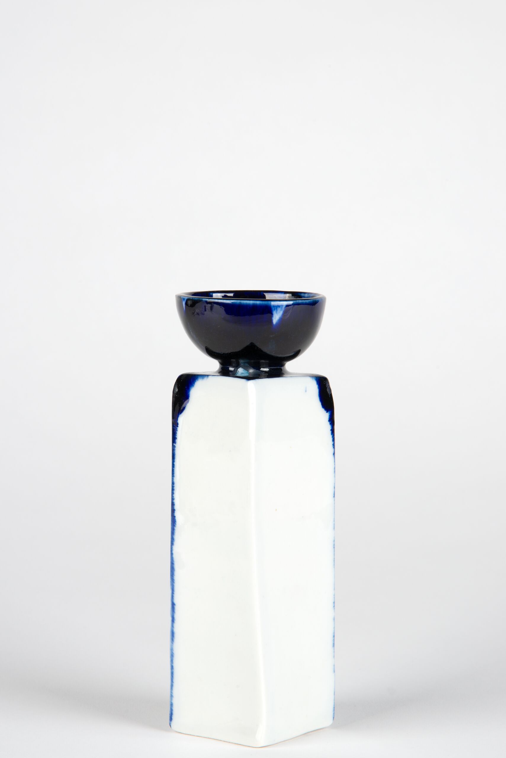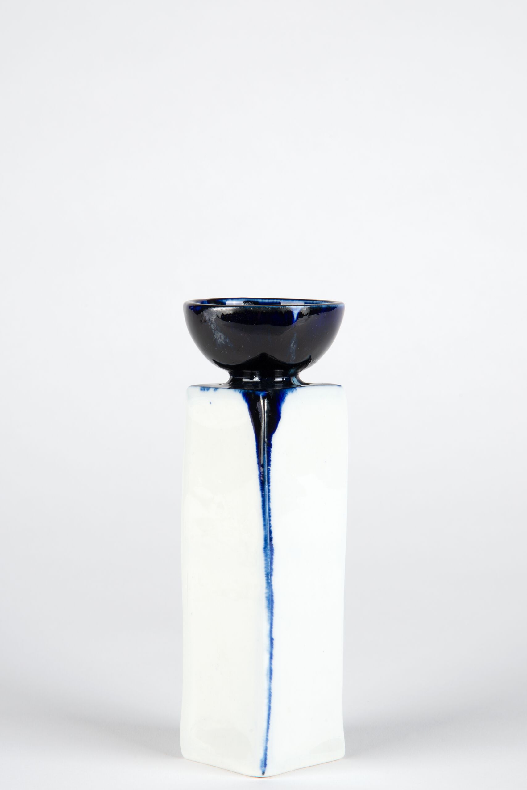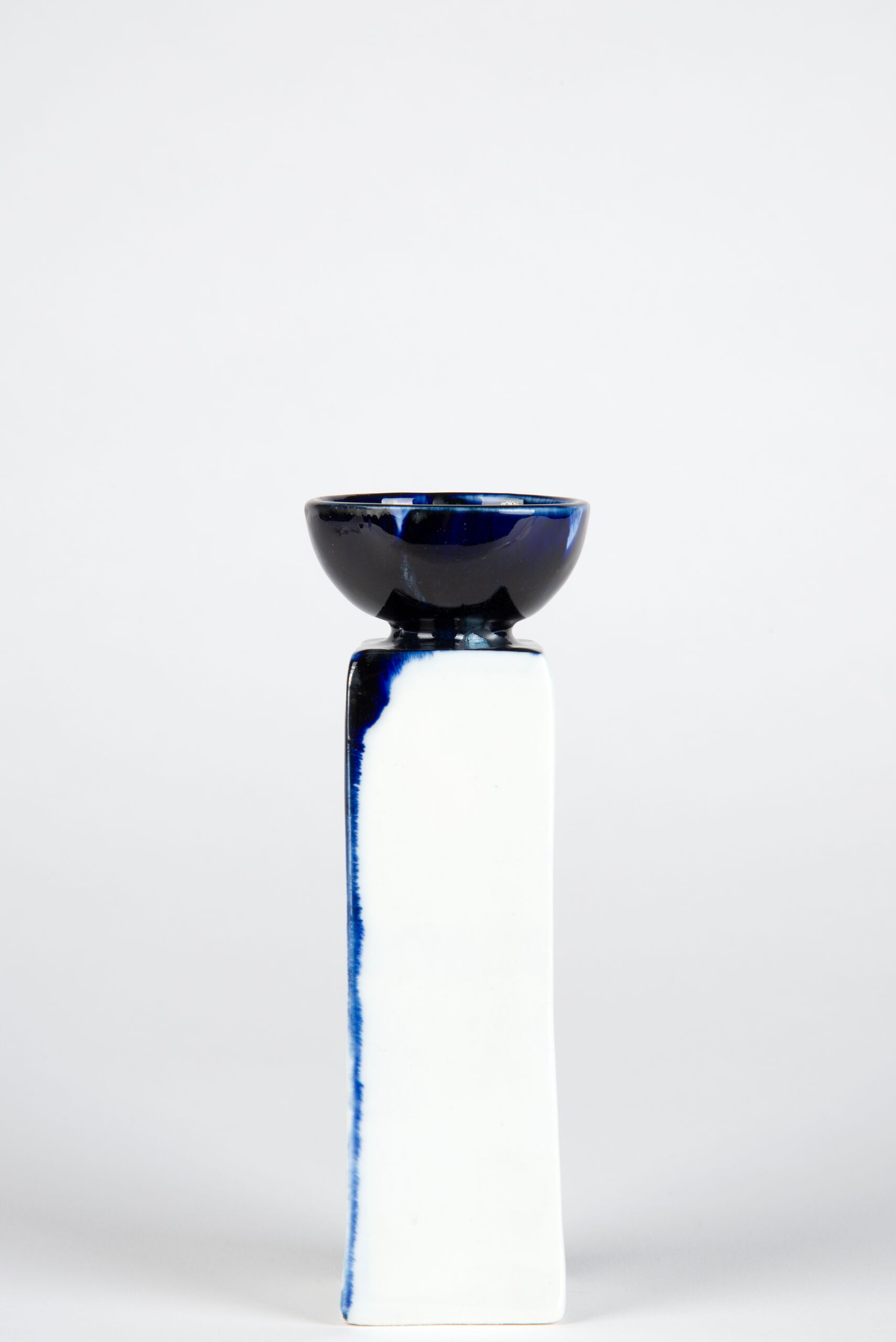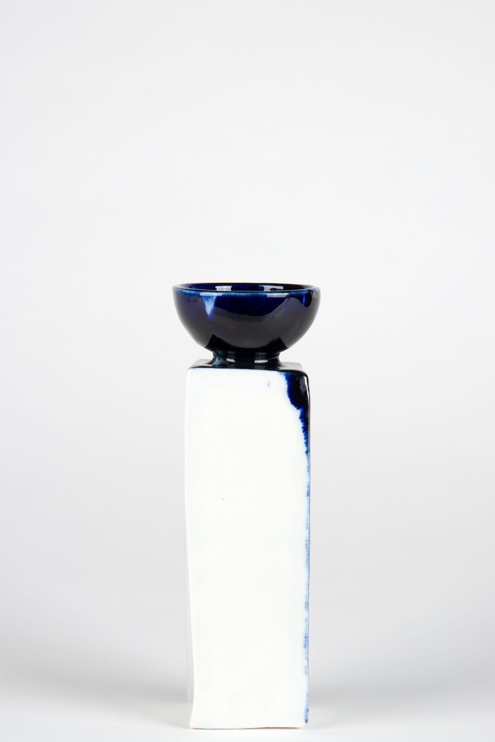 auf viereckigem hohen weißen Sockel halbkugelförmige kobaltblaue Schale. An zwei Diagonalkanten des Sockels abgelaufene blaue Glasur