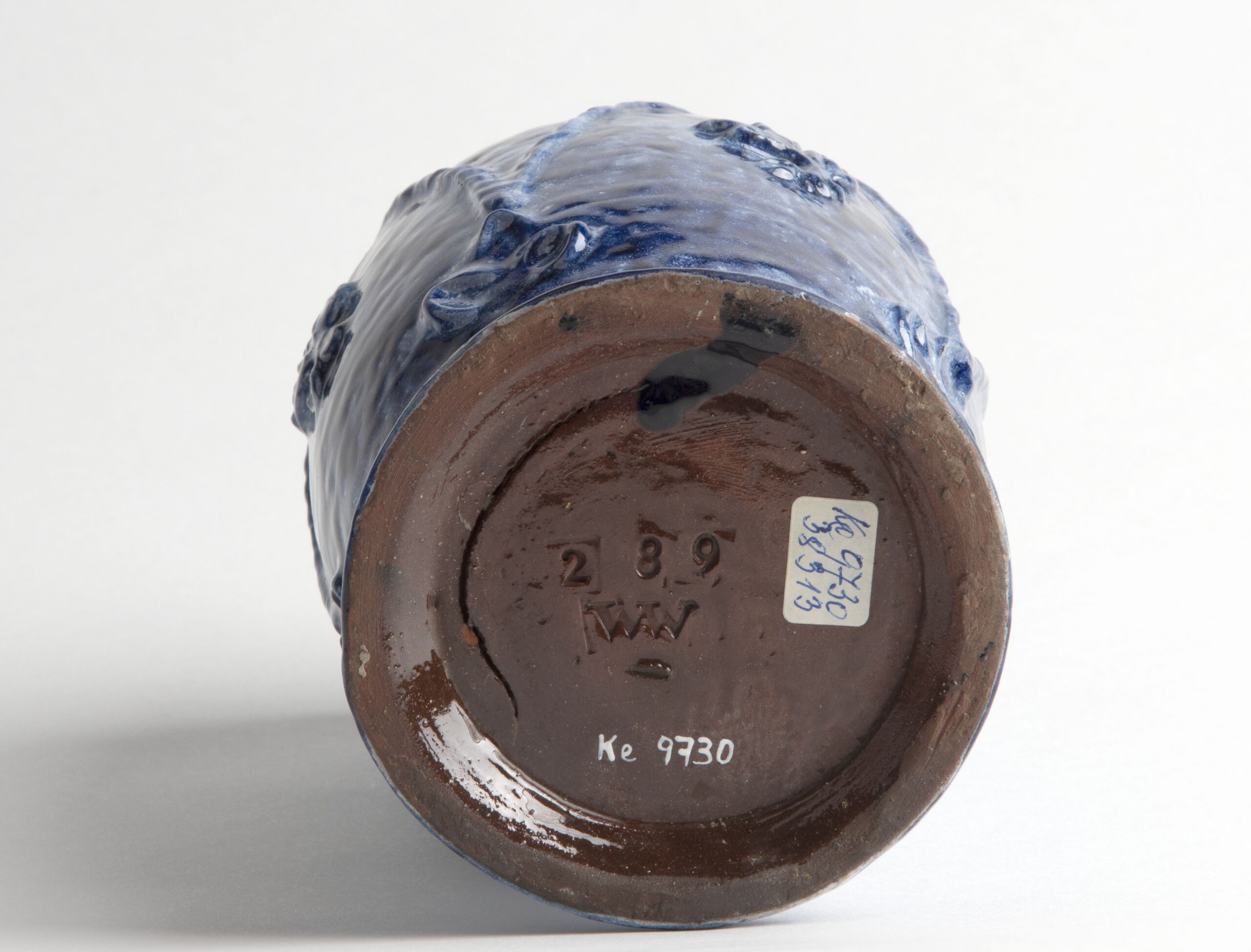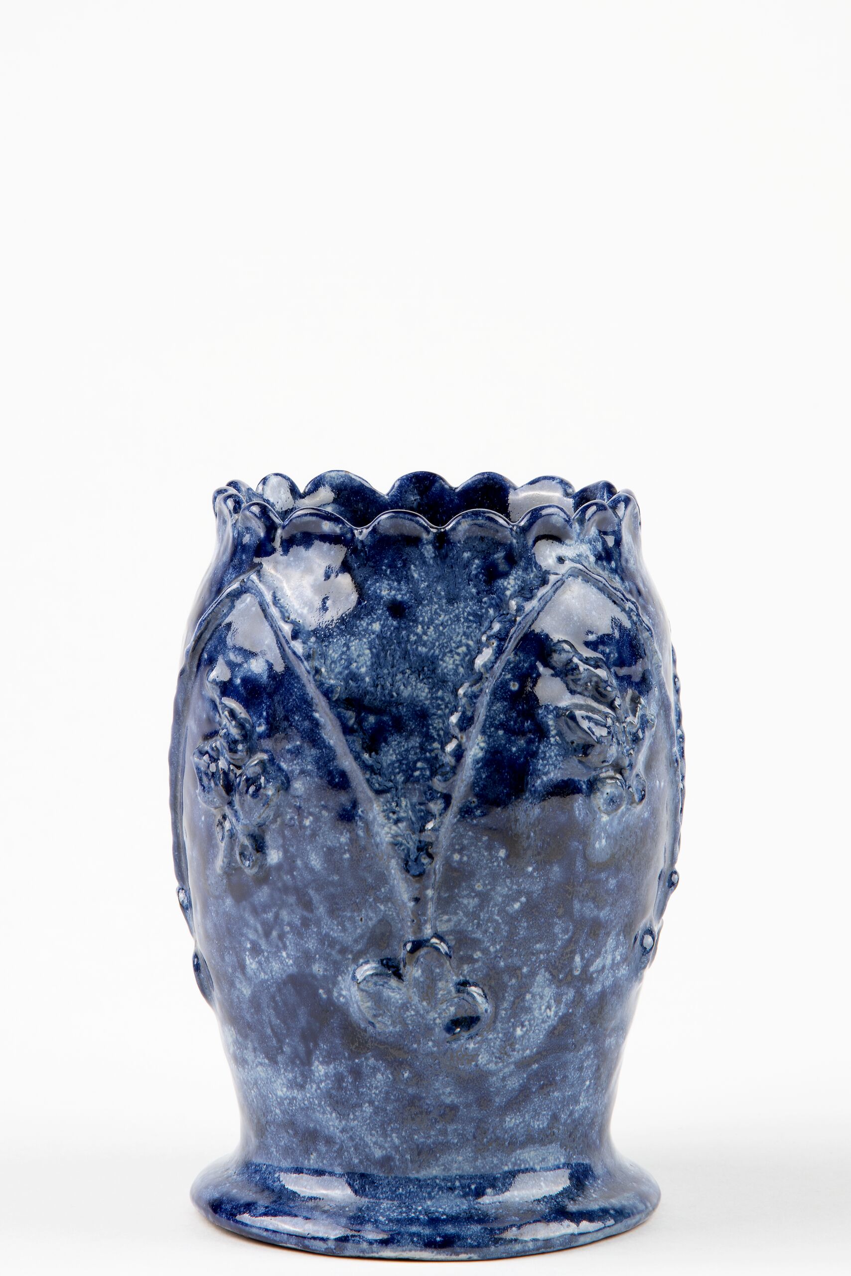 in Becherform, gesprenkelte blau-weiße Glasur, Spitzbogenrelief und Blütenzweige