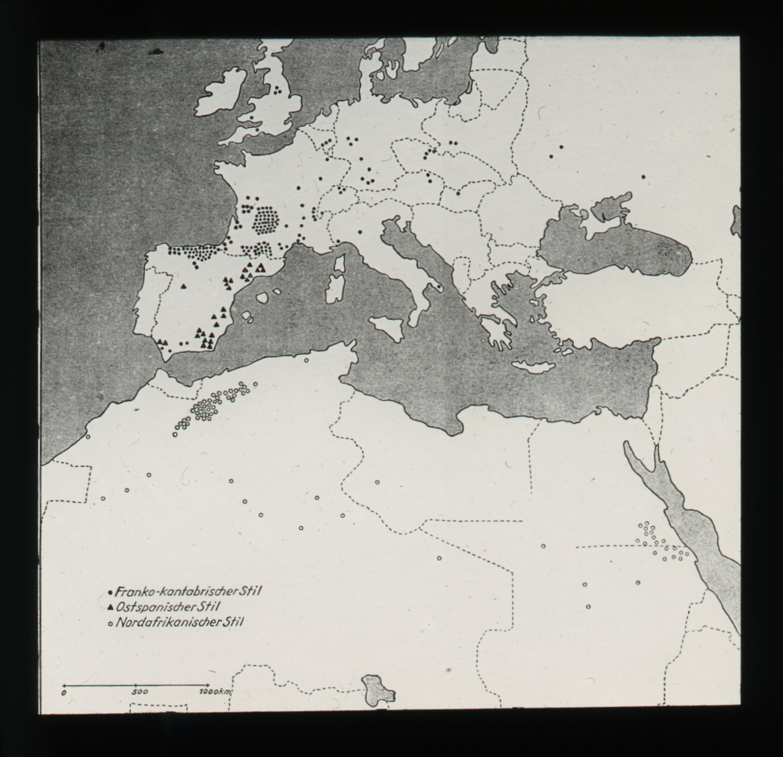 - text on object: Karte d. Verbreitung der paläolithischen Kunst. (Nach Kühn: Kunst u. Kultur d. Vorzeit Europas. Berlin 1926)