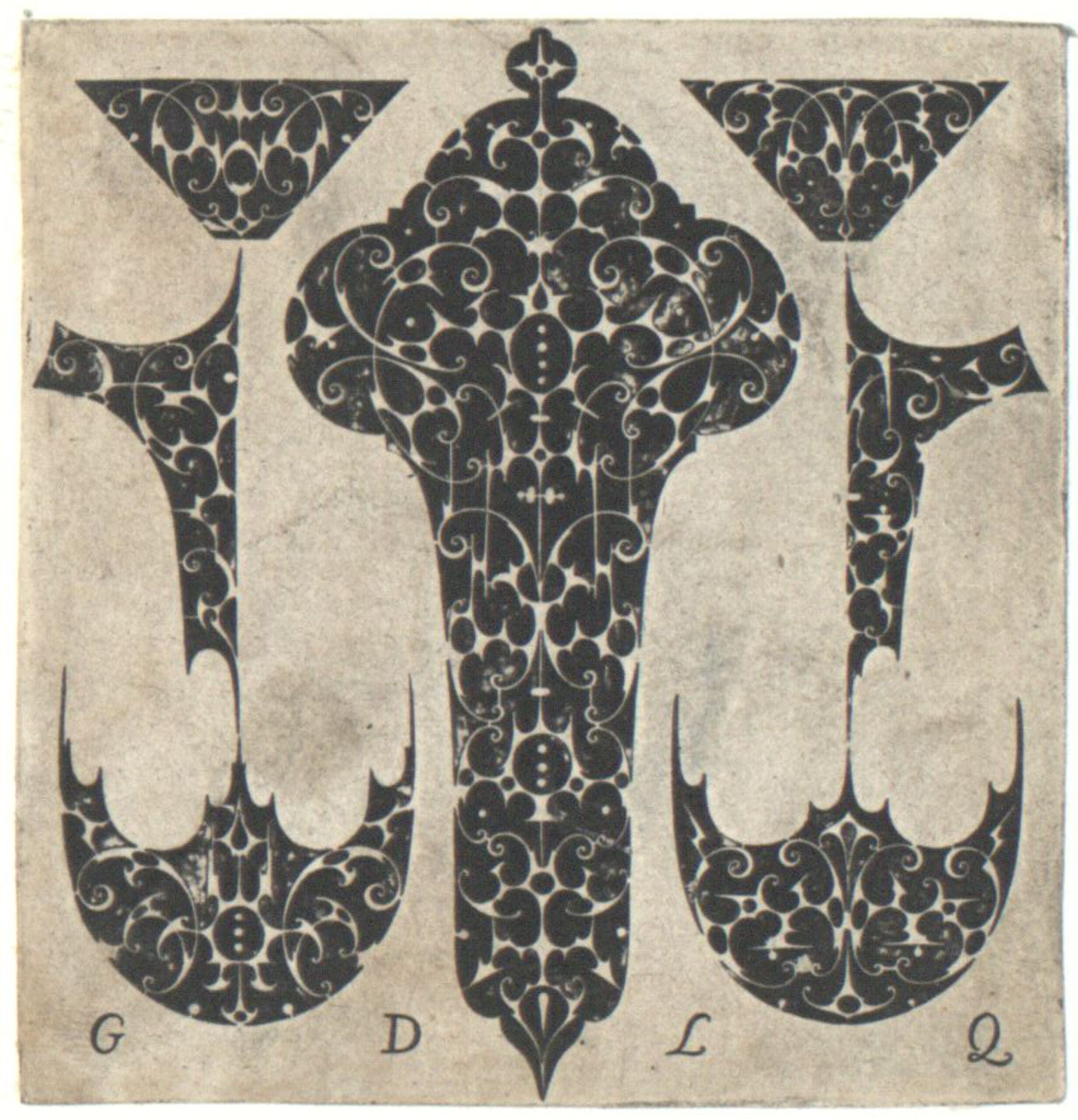 - Verschiedene Goldschmiedeornamente, Blatt aus einer Folge von nielliertem Goldschmiedeornament mit dem Titel „Ni capis, non carpis“, Schwarzornament (given title)