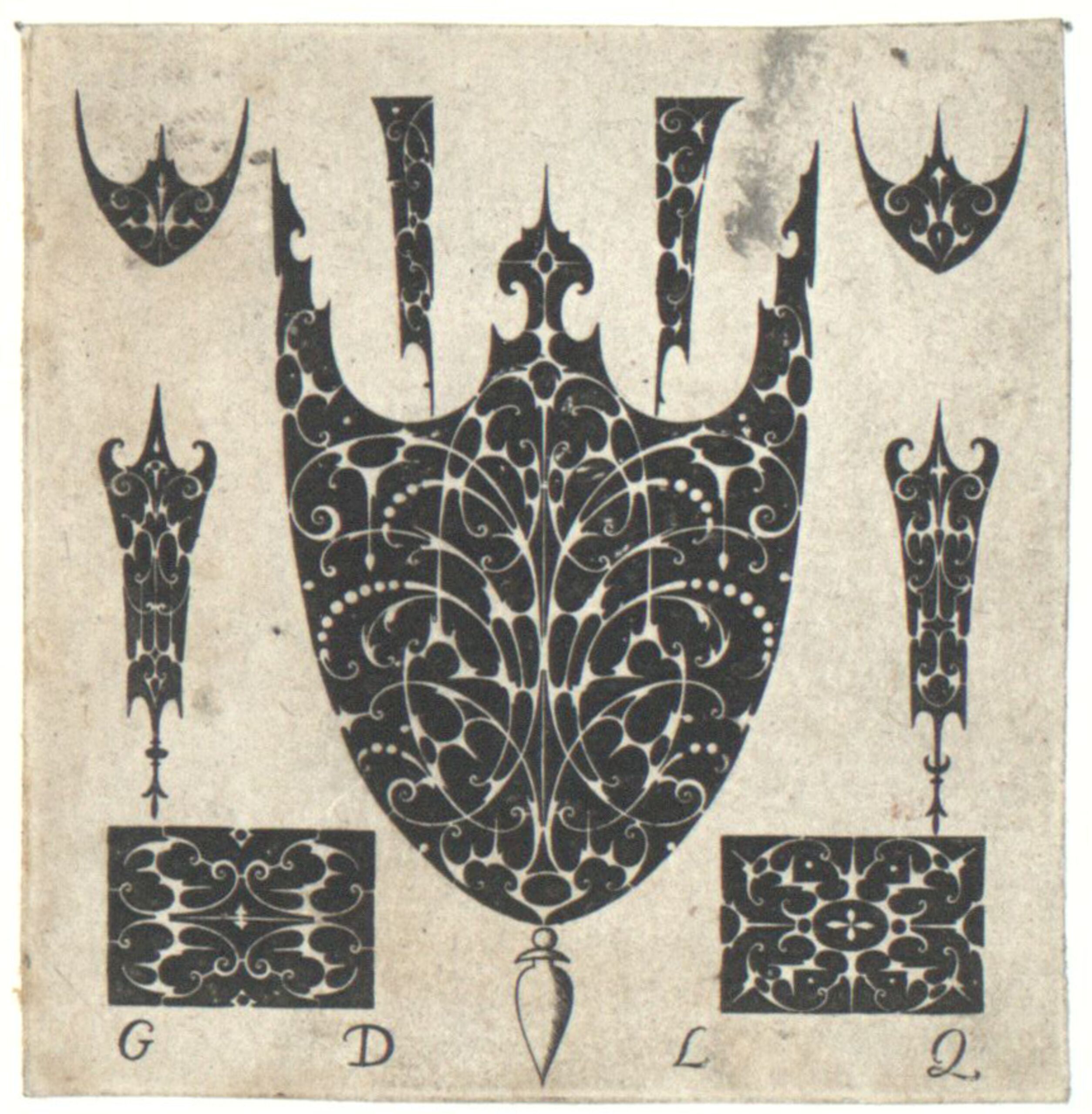 - Verschiedene Goldschmiedeornamente, Blatt aus einer Folge von nielliertem Goldschmiedeornament mit dem Titel „Ni capis, non carpis“, Schwarzornament (given title)