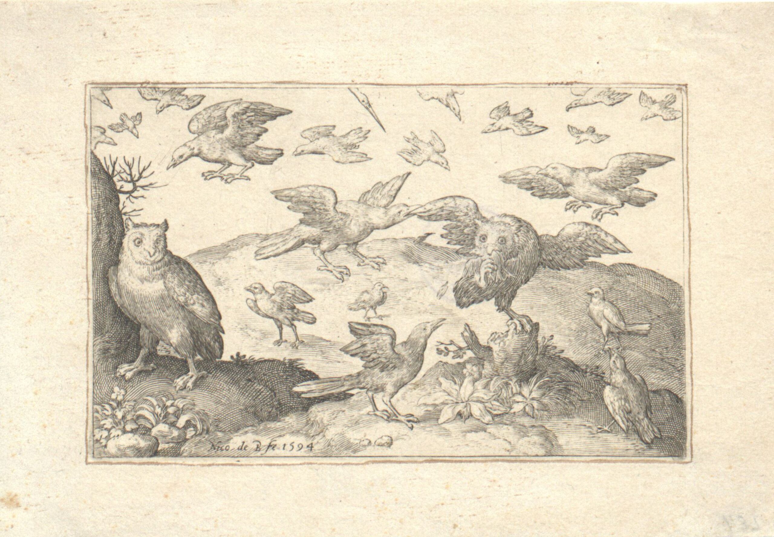 Druckgrafik, Verschiedene Vögel in einer Landschaft, Blatt aus der Folge „Volatilium Varii Generis effigies etc.“, Nicolaes de Bruyn, MAK Inv.nr. KI 284-3