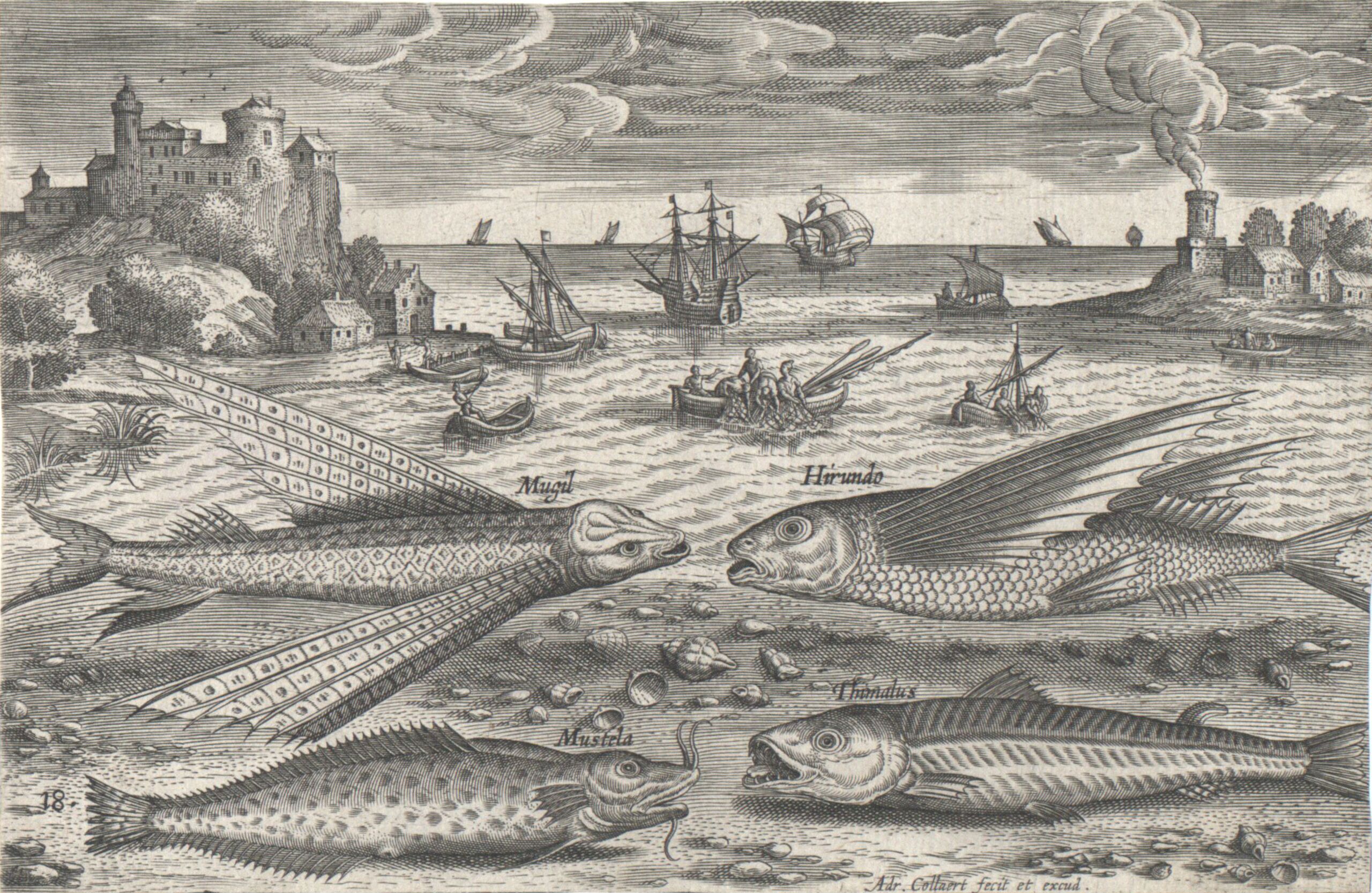 - Verschiedenen Fische mit den jeweiligen Bezeichnungen vor dem Hintergrund einer Landschaft, Blatt 18 aus der Folge „Piscium Vivae Icones“, herausgegeben von A. Collaert (given title)