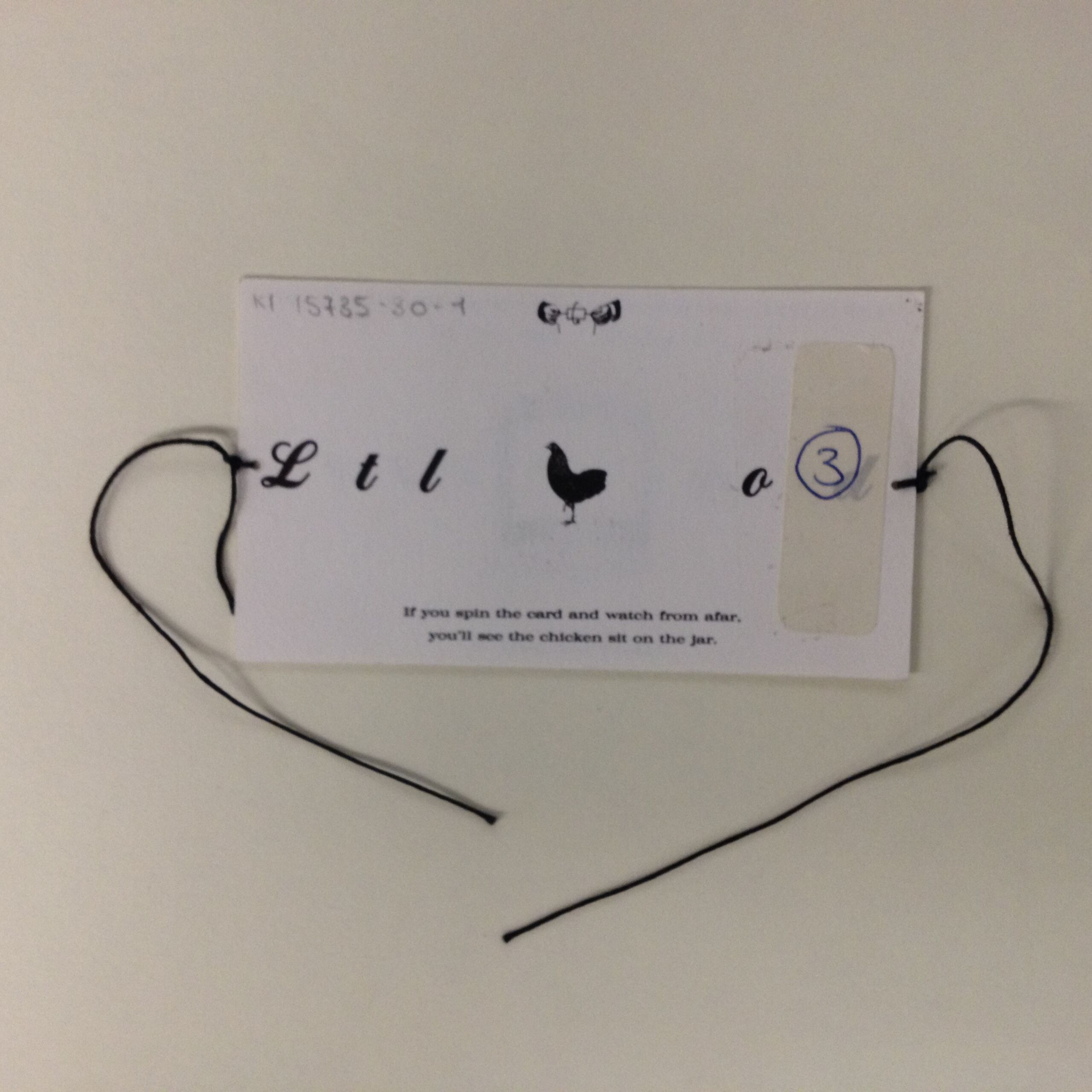 - text on object (back side) : Ltl od / If you spin the card and watch from afar. / you'll see the chicken sit on jar.