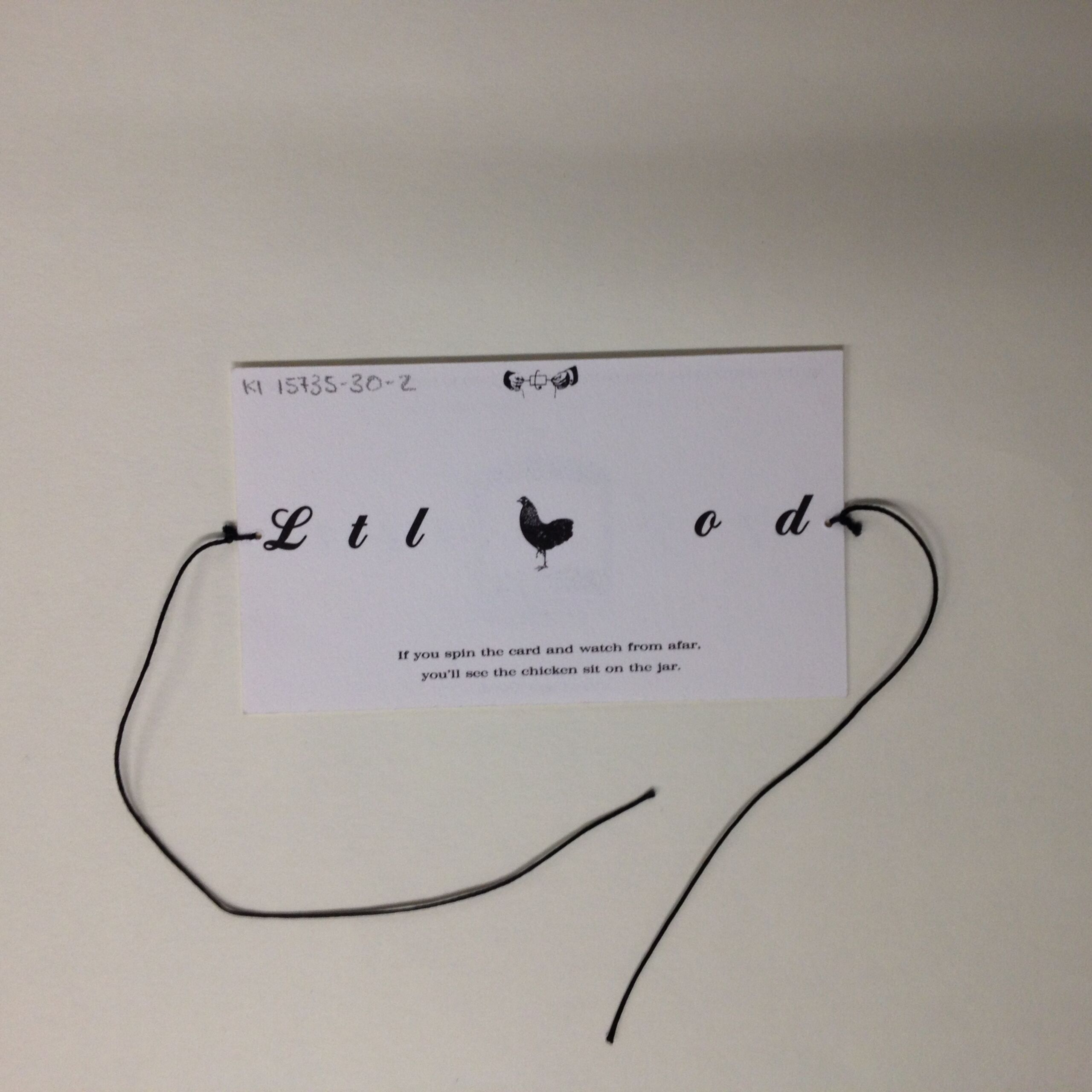 - text on object (back side) : Ltl od / If you spin the card and watch from afar. / you'll see the chicken sit on jar.
