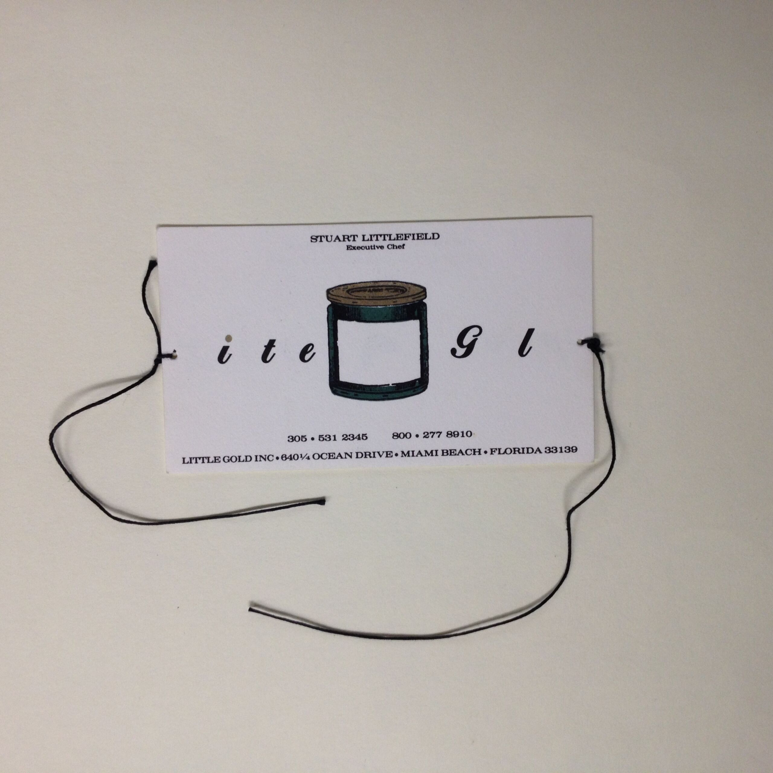- text on object: Tony Goldman / Proprietor / ite Gl / 305 531 2345 800 277 8910 / Litte Gold Inc. 640 1/4 Ocean Drive. Miami Beach. Florida 33139
