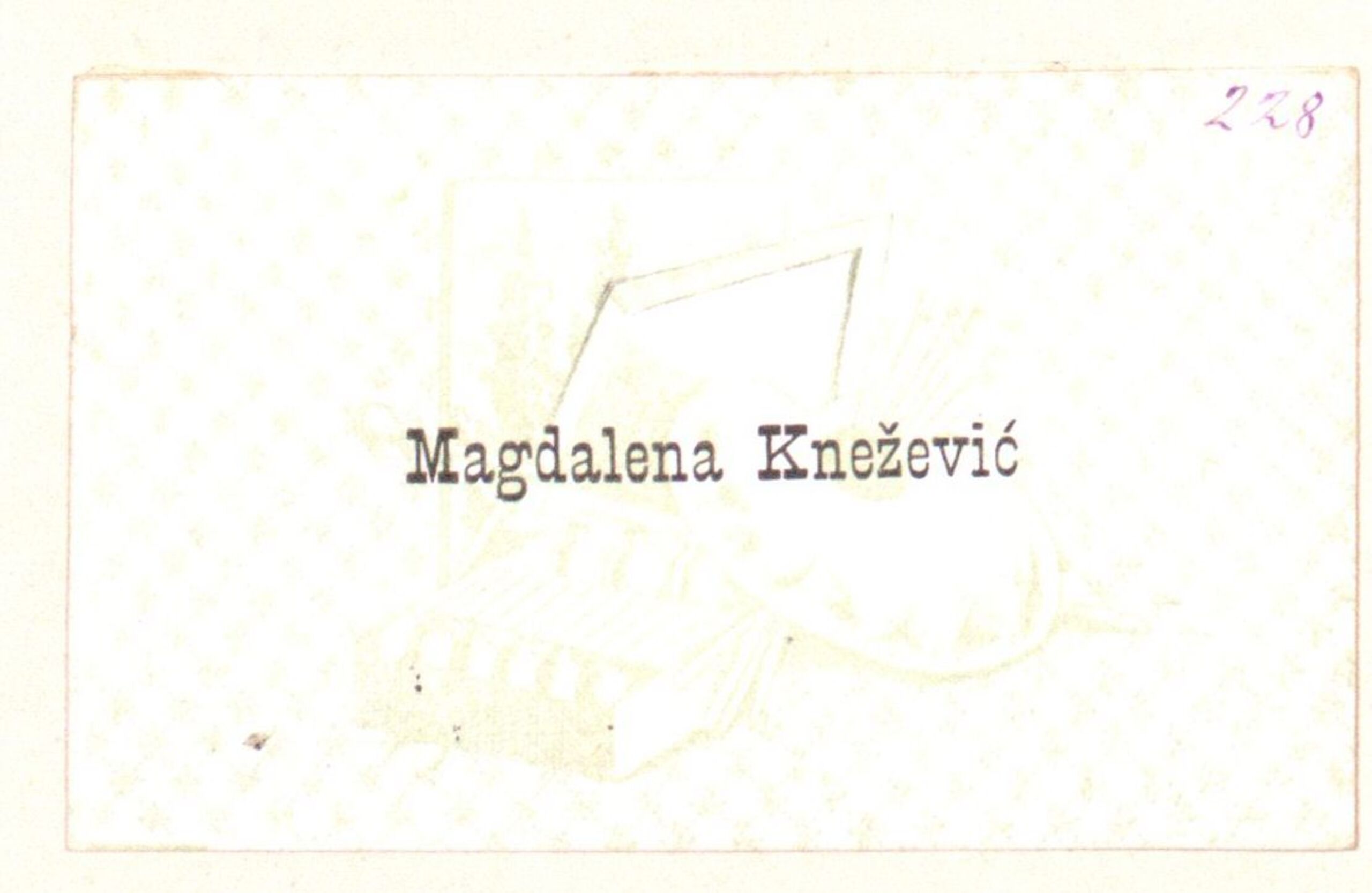 - text on object: [In der Mitte:] Magdalena Knežević [Rechts oben:] 228 [Handgeschriebener Text, Feder in violett]