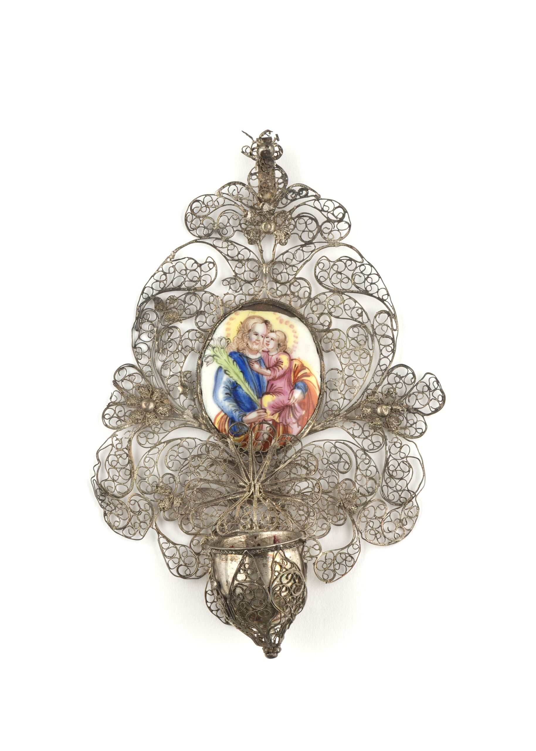 - Weihwasserkessel mit Emailbildchen "Hl. Josef mit Kind"