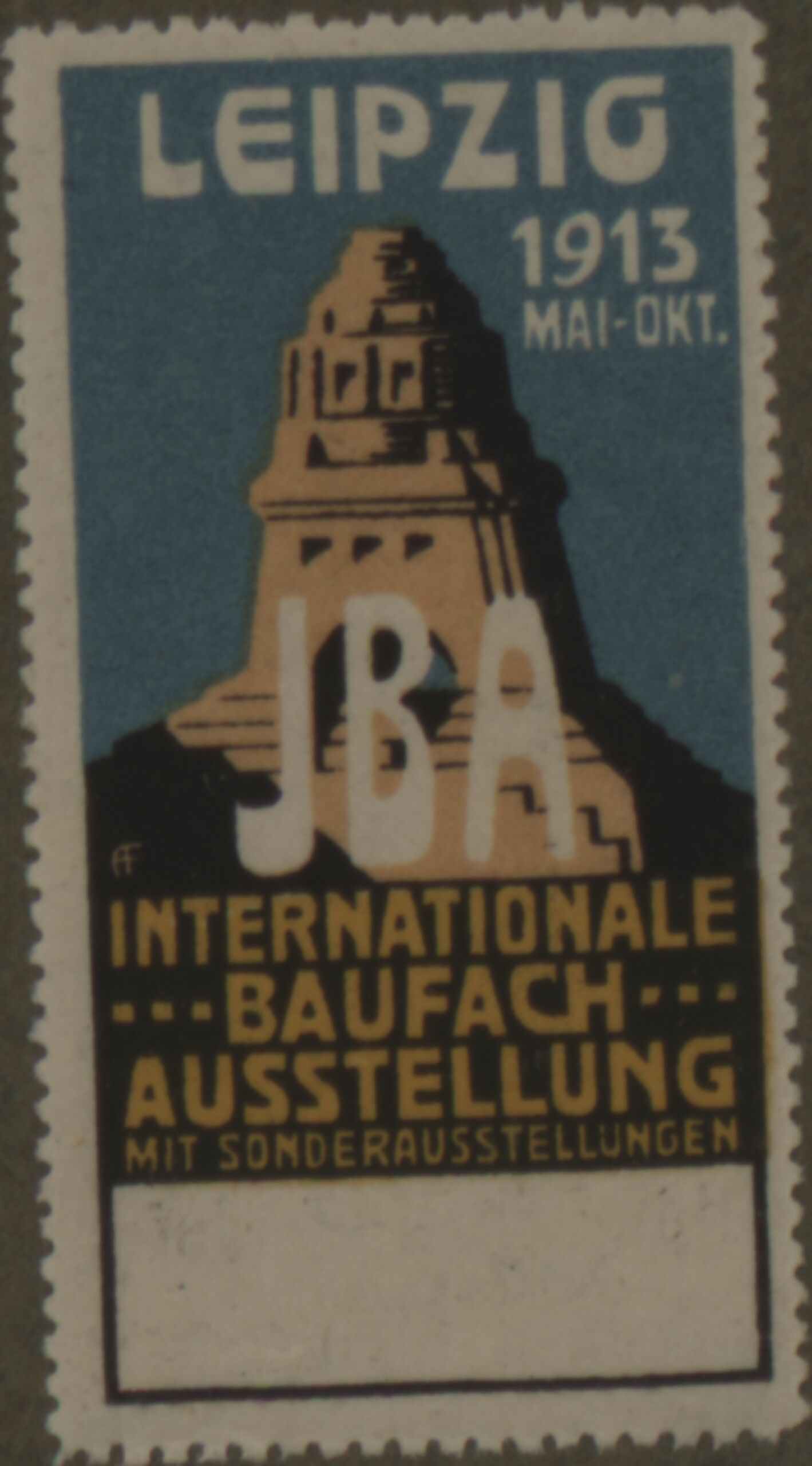 - text on object: LEIPZIG / 1913 / MAI-OKT. / JBA / INTERNATIONALE / BAUFACH / AUSSTELLUNG / MIT SONDERAUSSTELLUNGEN [gedruckter Text]