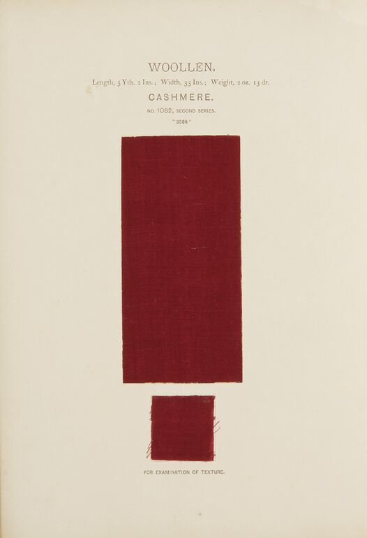 - Text am Objekt: WOOLLEN. / Length, 2 Yds. 33 ½ Ins., Width, 30 Ins., Weight, 1 Ib. 13 OZ. 4 dr Price per Yard 1 S. 2 d. / KURRACHEE. / NO. 1022, SECOND SERIES. / "11813"
