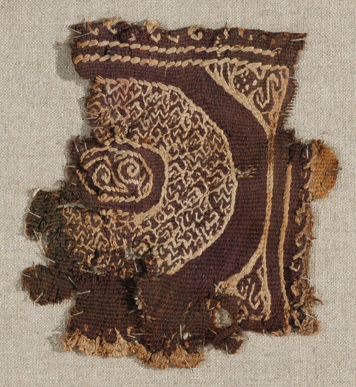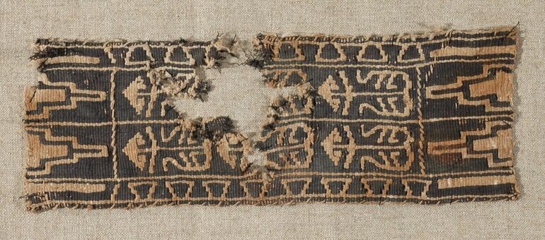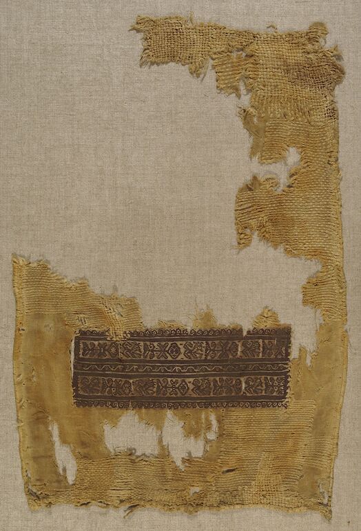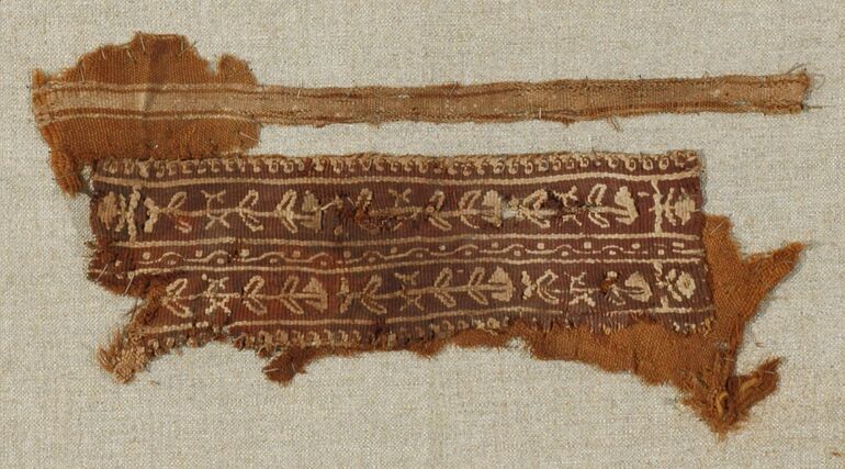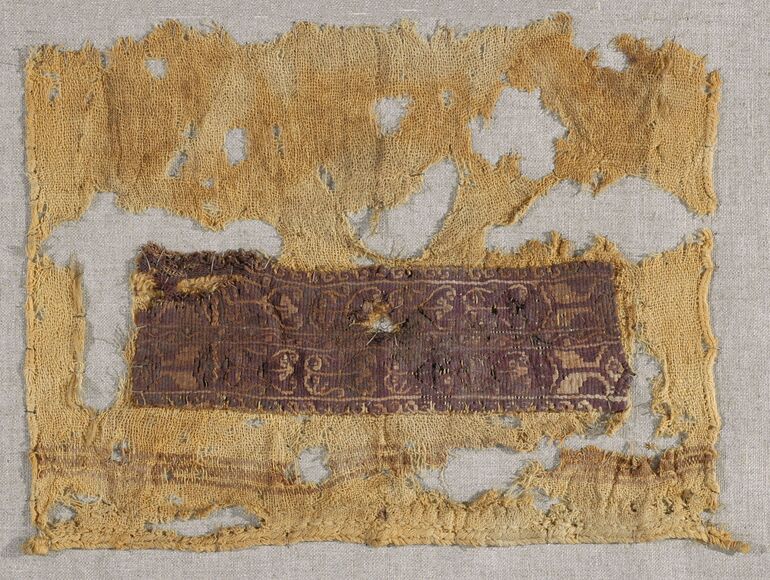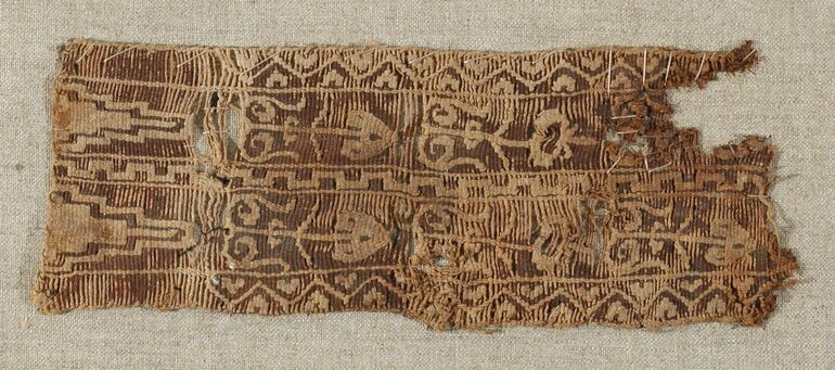- Woollen textile; patterns arranged in rows, polychrome wave meanders with a pattern of stylised leaves and lattice (descriptive title)