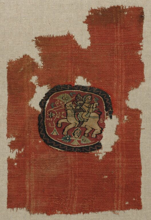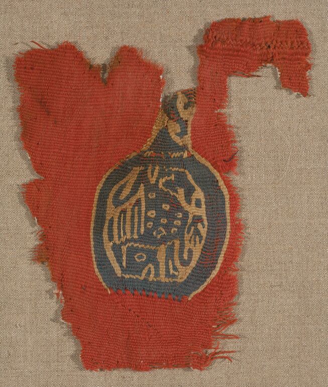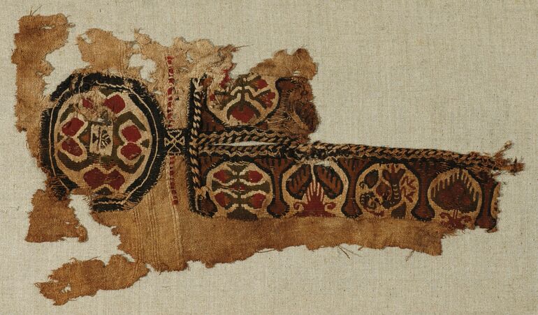 - Woollen tunic with two decorative bands (clavi) and one roundel (orbiculus), neckband; stylised plants reduced to lines (descriptive title)