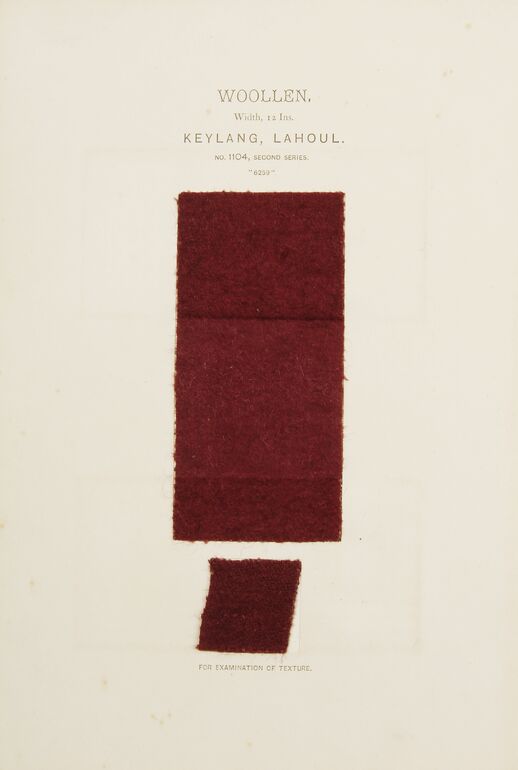 - text on object: WOOLLEN. / Length, 2 Yds. 18 Ins., Width, 23 Ins., Weight, 5 OZ. 9 dr. Price per Yard 6 d. / KUTCH. / NO. 1019, SECOND SERIES. / "6119" / FOR EXAMINATION OF TEXTURE