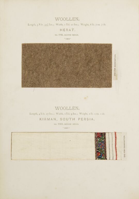 - text on object: WOOLLEN. / Length, 5 Yds. 5 Ins., Width, 1 Yd. 29 Ins., Weight, 5 Ib. 9 OZ. / DELHI. / NO. 1034, SECOND SERIES. / "12672" / FOR EXAMINATION OF TEXTURE