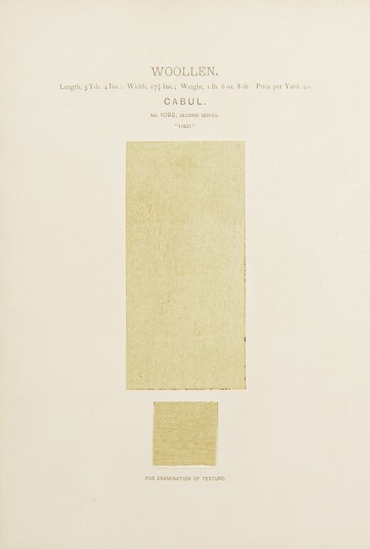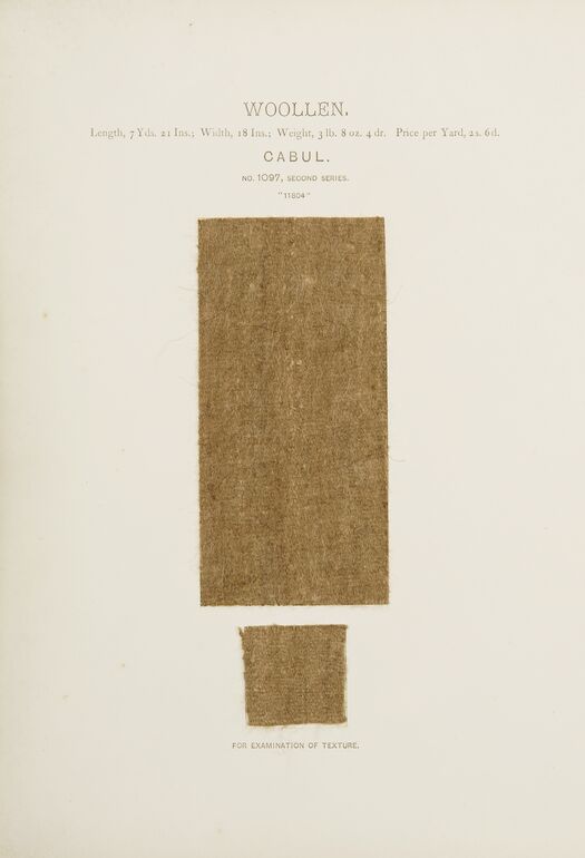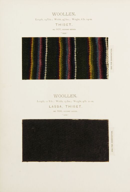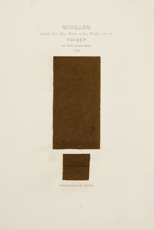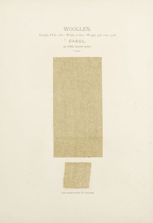 - text on object: WOOLLEN. / Length, 3 Yds. 5 ½ Ins., Width, 1 Yd. 11 Ins., Weight, 1 Ib. 2 OZ. 4 dr. / LAHORE. / NO. 1044, SECOND SERIES. / "7893" / FOR EXAMINATION OF TEXTURE