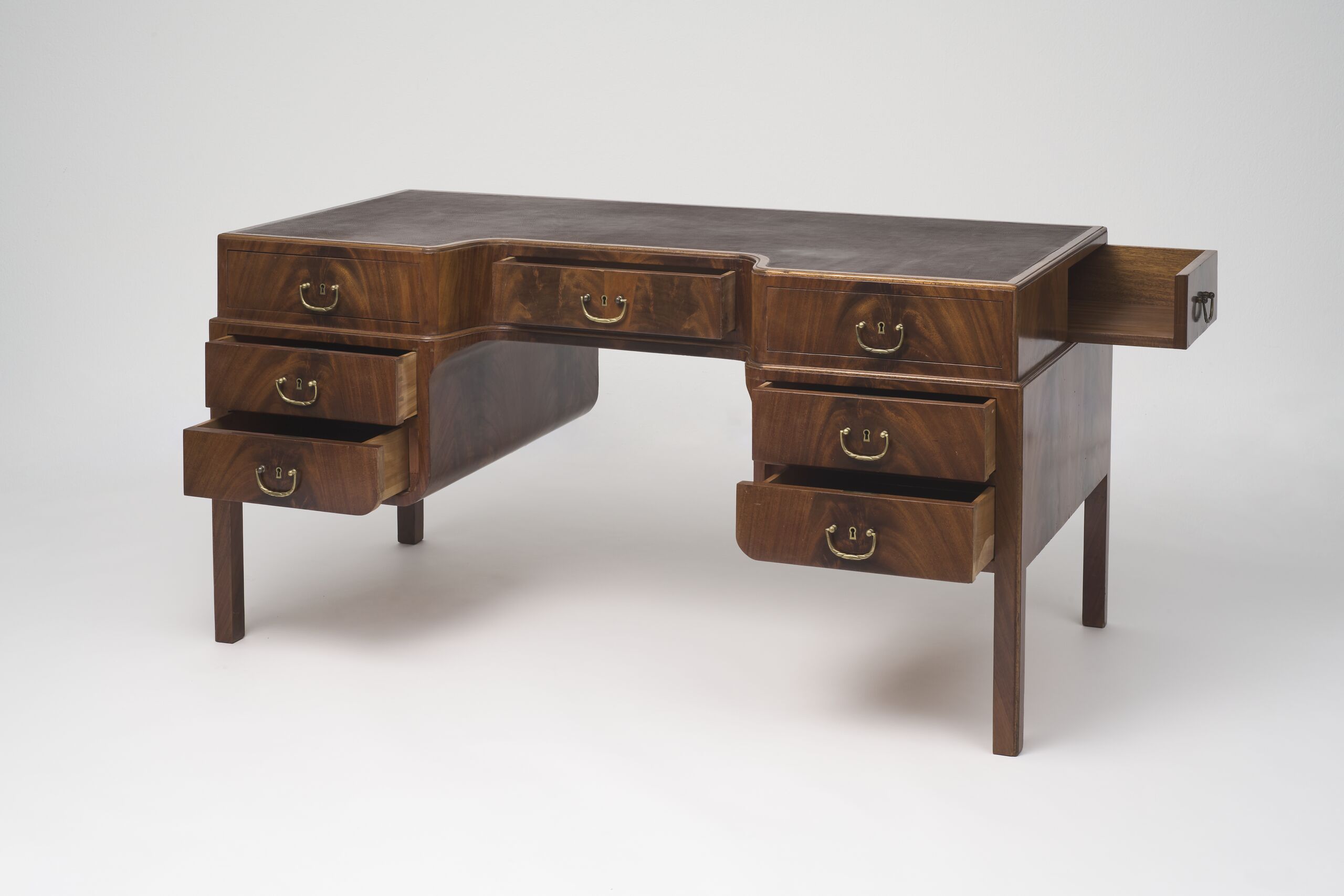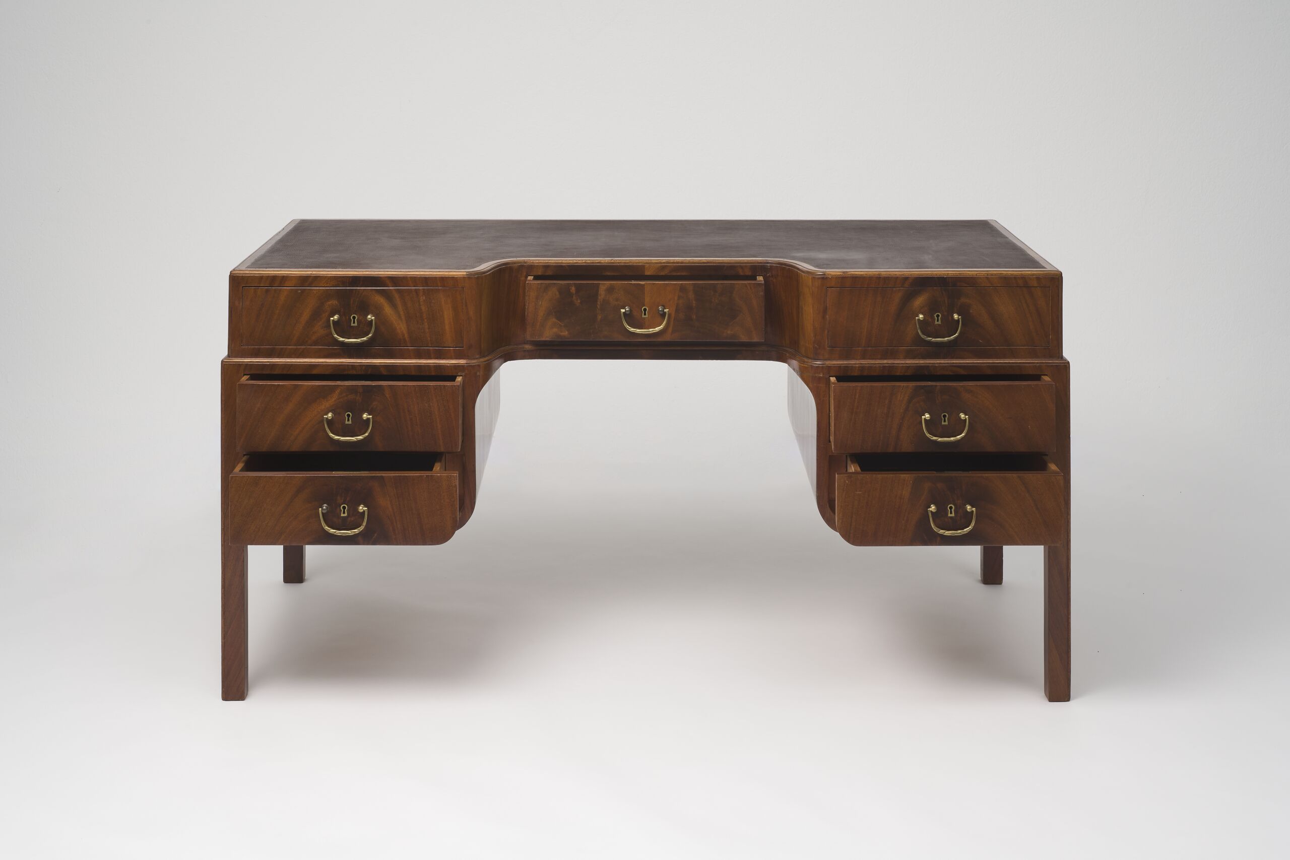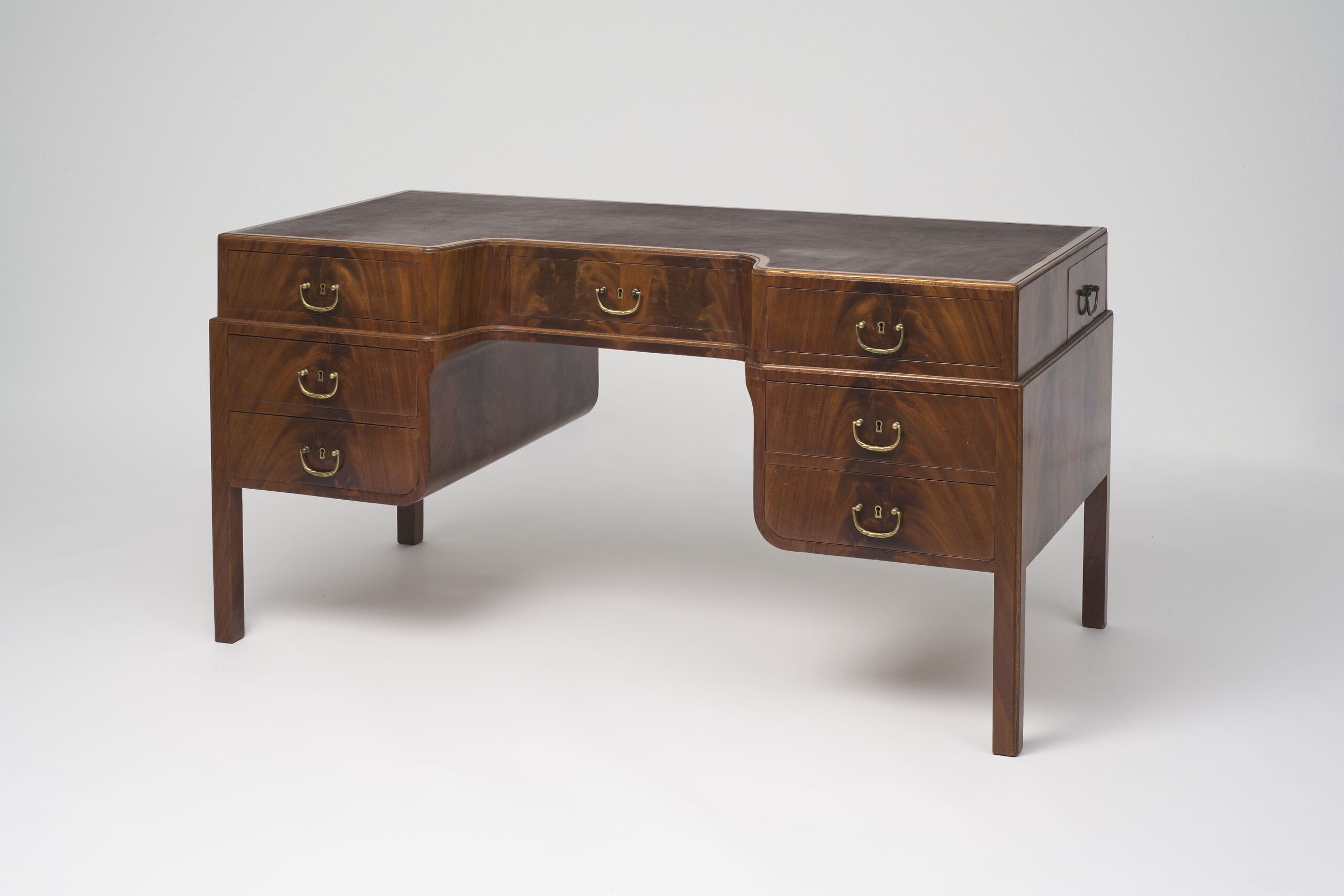 massiv und furniert; Messing; erneuerte Lederbespannung
