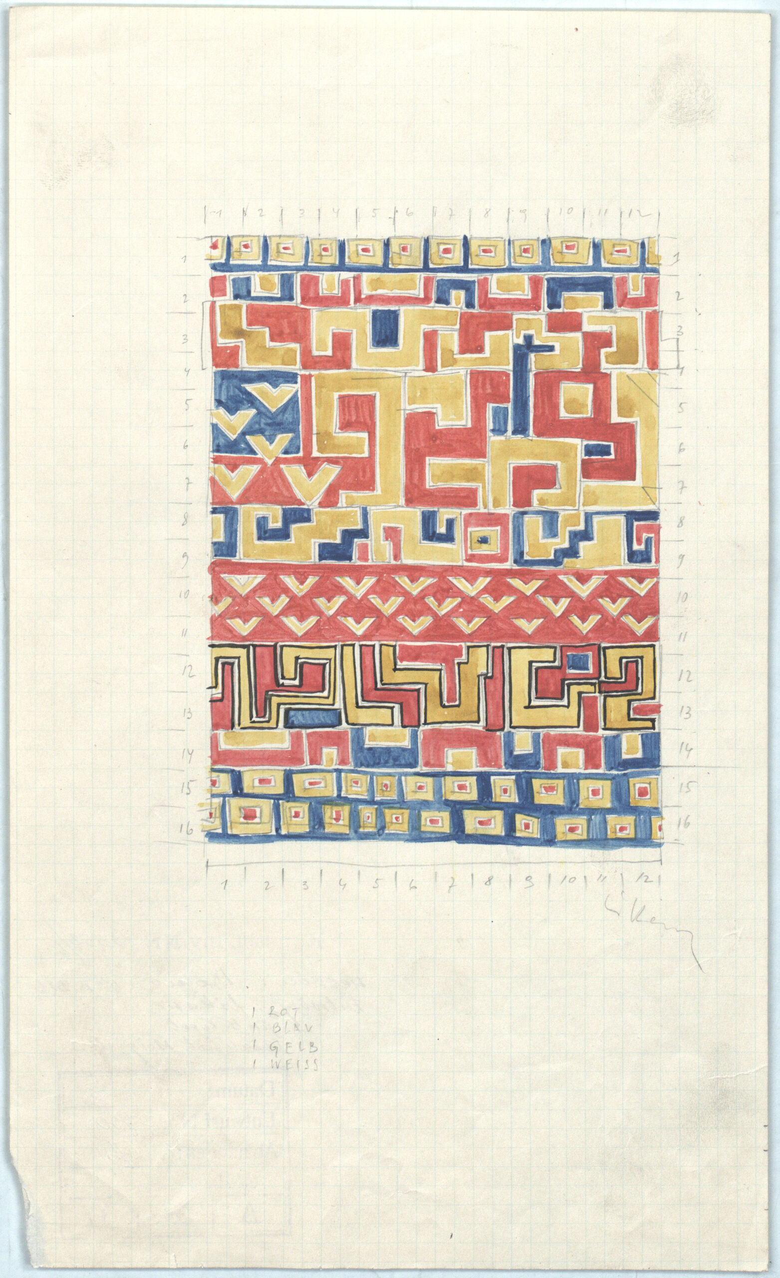 - text on object: Likarz/1 rot/1 blau/1 gelb/1 weissverso: Dessin: „Dome“ No B 316/Entwurf: Likarz./für W. Vogel/Qualität Mouquette