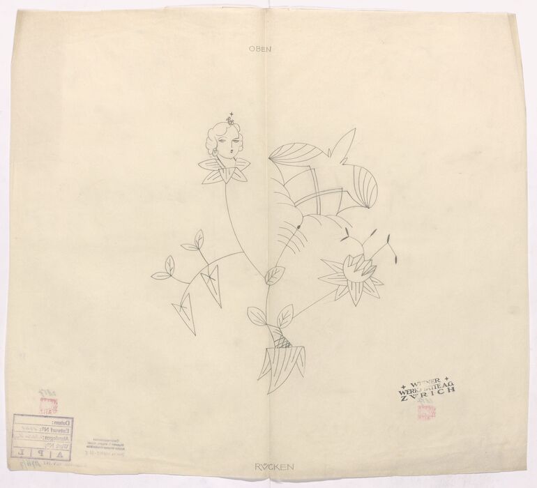 - WW Stempel: Wiener Werkstätte A.G. Zürich; Dieser Entwurf ist geistiges Eigentum der Wiener Werkstätte Ges.m.b.H. in Wien und steht unter dem Schutze des Urheberrechtes (verso)