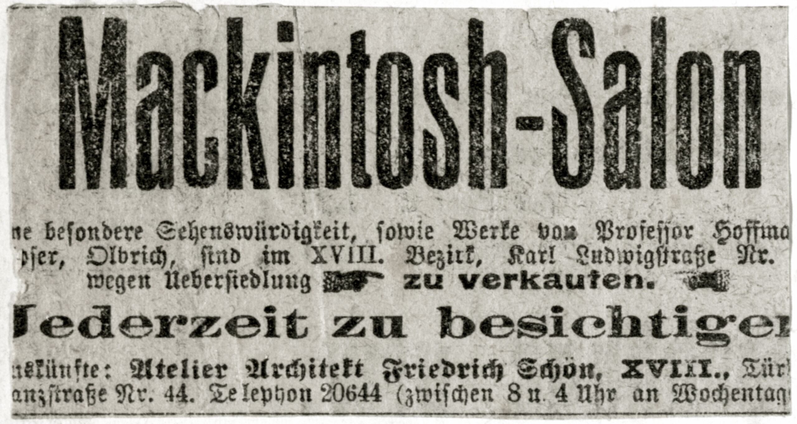- Zeitungsausschnitt, Ankündigung über den Verkauf von Objekten der Entwerfer Josef Hoffmann, Koloman Moser und Joseph Maria Olbrich anlässlich des Hausverkaufes Waerndorfer, Wien XVIII