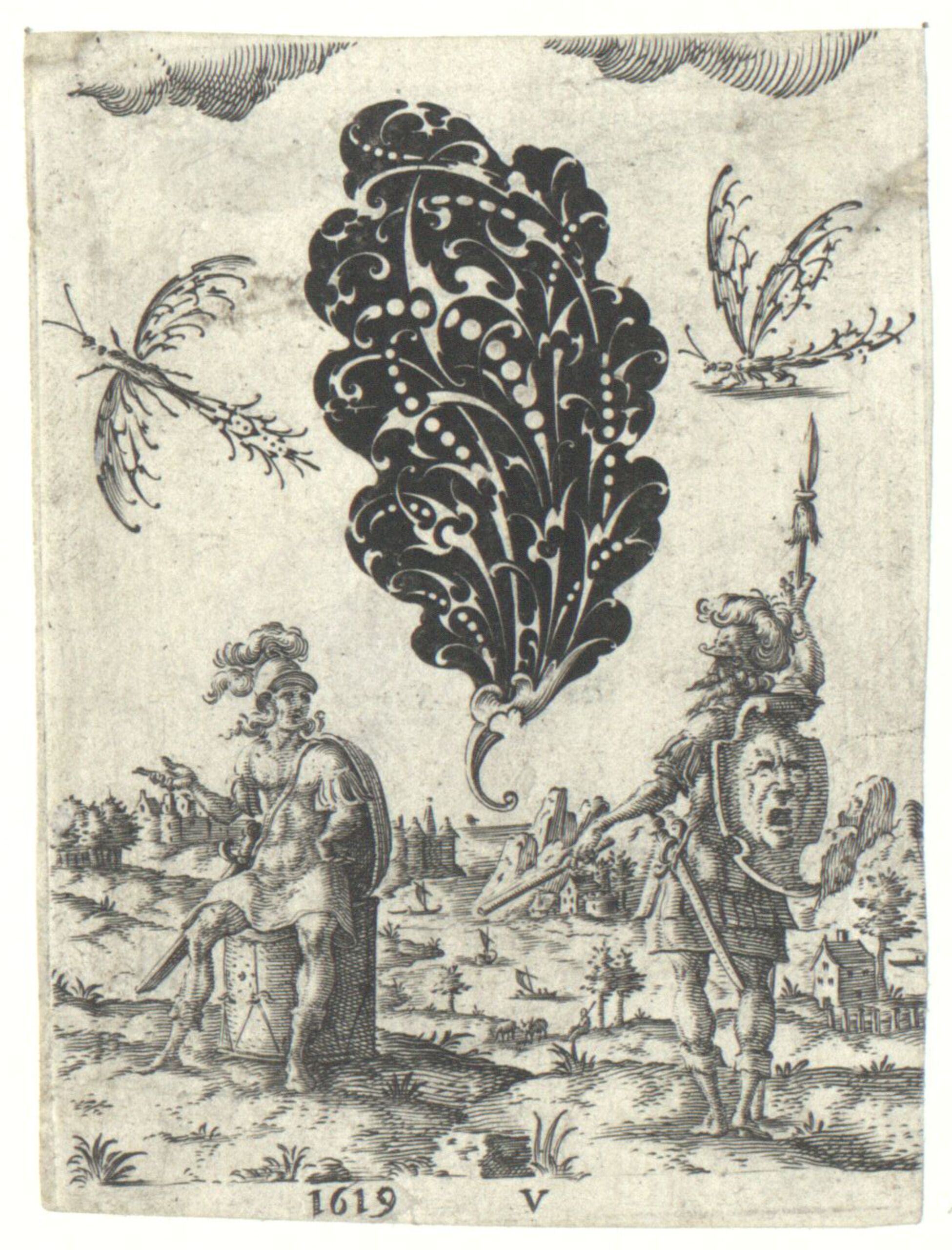 - Zwei Krieger, Blatt aus einer Folge von figuralen Szenen, darüber jeweils Goldschmiedeverzierungen, seitenverkehrte Version siehe Jacob von der Heyden, Fach 34/26-31, Schwarzornament (given title)