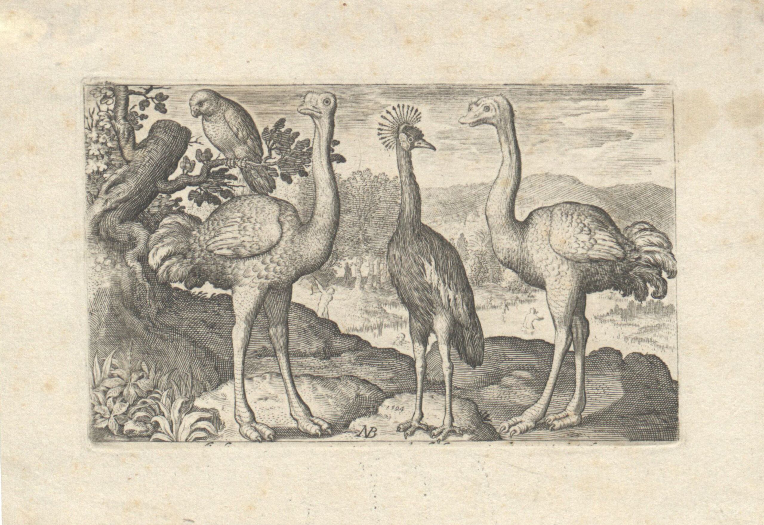 - Zwei Strauße, ein Kranich und ein Papagei in einer Landschaft, Blatt aus der Folge „Volatilium Varii Generis effigies etc.“ (given title)