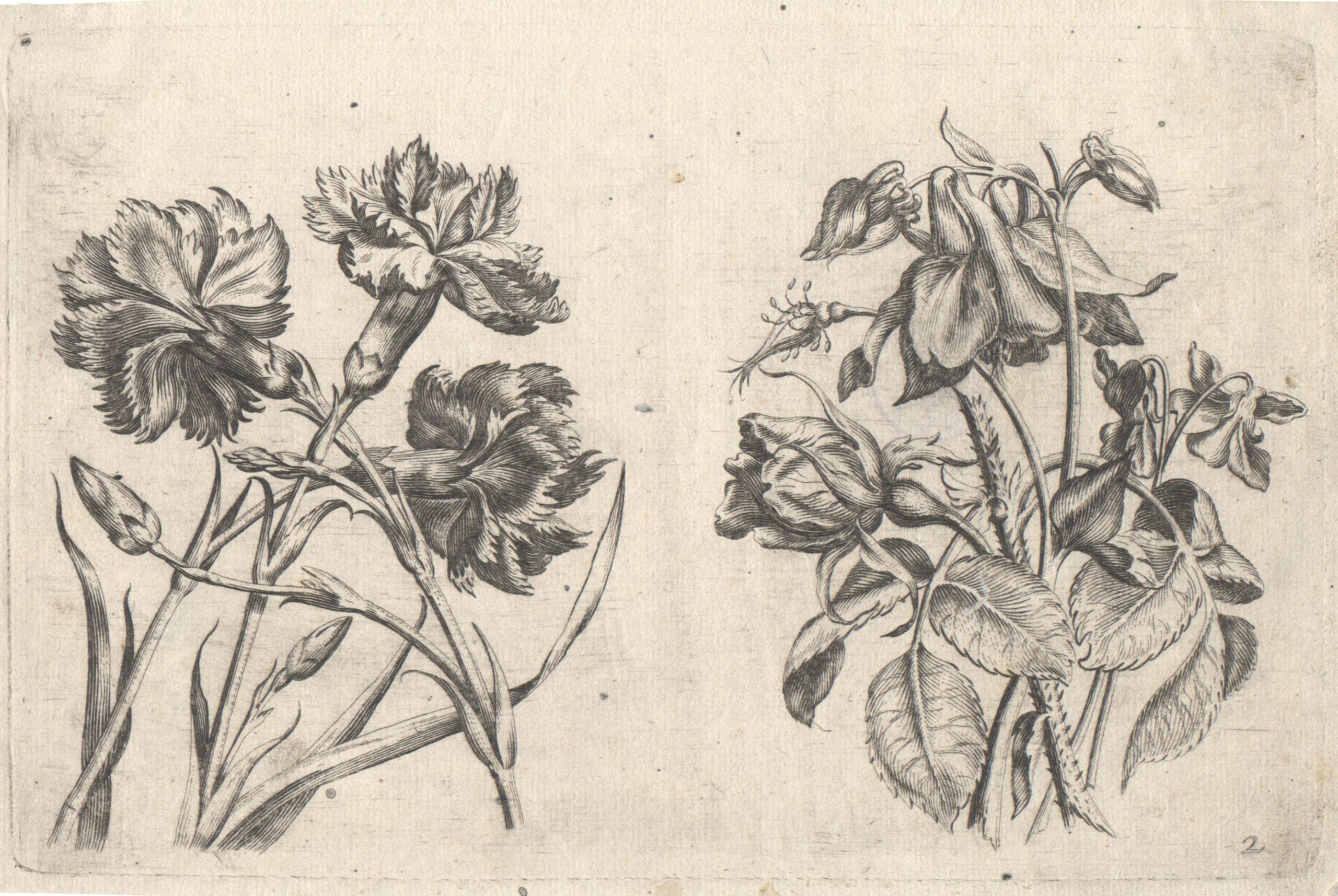 - Zwei verschiedene Blumen, Blatt 2 aus einer Folge von Nachstichen nach de la Fleurs „Giardino di Fiori“, herausgegeben von Jacob Sandrart, Verlagsnummer 23 (given title)