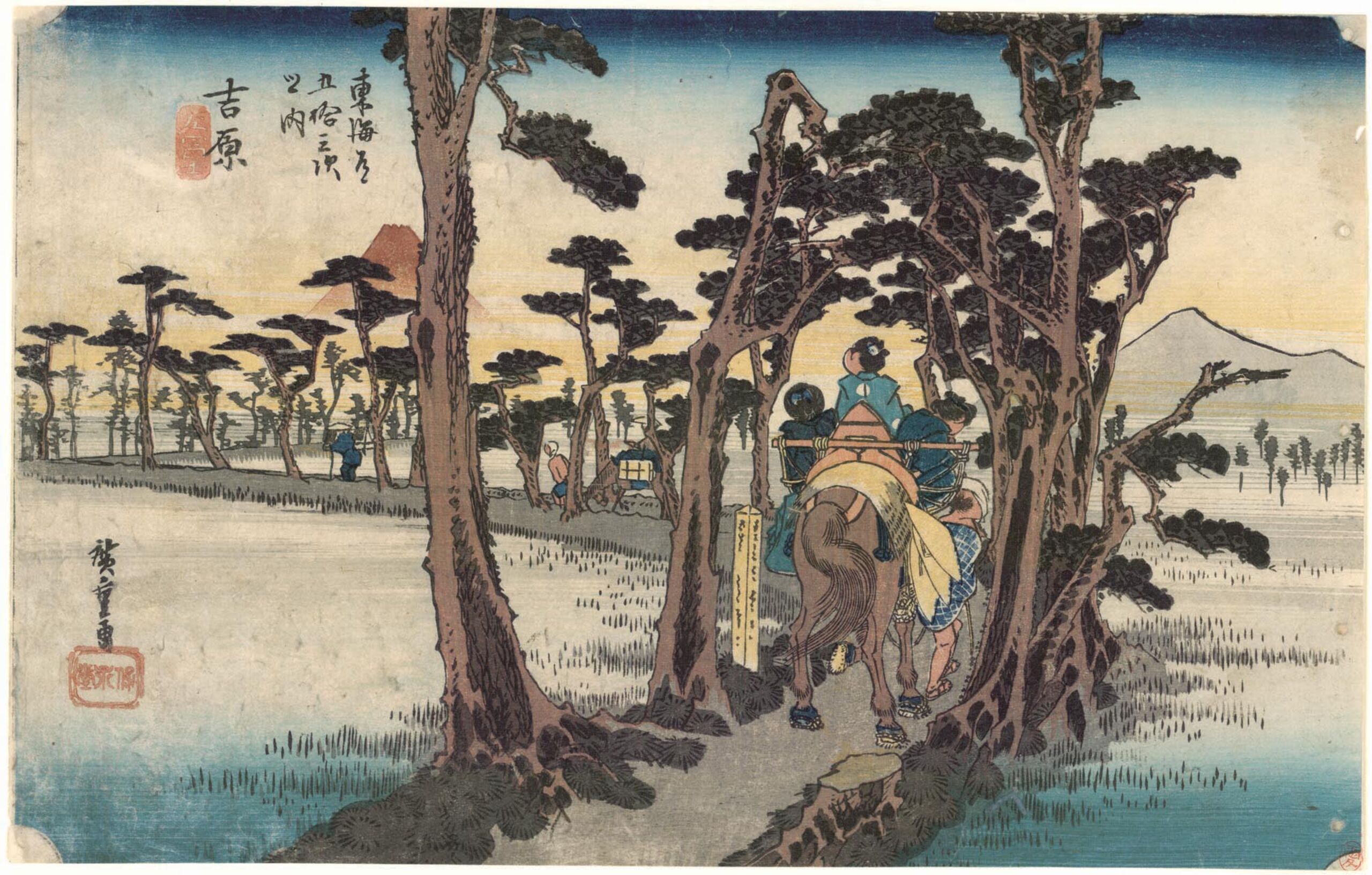 Blatt 15, Station 14. Die Poststation Yoshiwara 吉原 lag früher nahe am Meer, wurde dann aber von einer tsunami dem Erdboden gleich gemacht. Das neue Yoshiwara verlegte man weiter ins Landesinnere, sodass der Weg vom Meer weg durch die Reisfelder führt. Auf diesem Weg befinden sich die Reisenden auf dem Bild. Gewöhnlich lag bei dieser Reise vom ehemaligen zum neuen Yoshiwara der Fuji auf der rechten Seite des Weges. Da sich der Weg durch die Reisfelder hin- und herschlängelte, konnte der Fuji plötzlich auch auf der linken Seite liegen. Daher der Untertitel des Bildes "Der Fuji auf der linken Seite". Auf dem Pferd in der Bildmitte sitzen drei Reisende, eine (für vermögende Leute) nicht ungewöhnliche Art des Reisens in der Edo-Zeit.