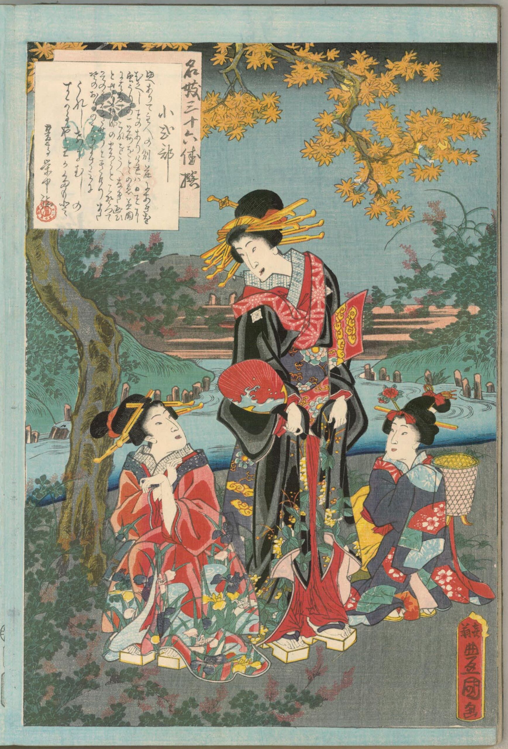 Serie mit einer Auswahl der 36 schönsten und berühmtesten Kurtisanen und Texten zu ihrem Leben. Eine Kurtisane mit zwei Begleiterinnen. Spätsommerszene mit bereits etwas verfärbten Ahornblättern und blühendem Buschklee (hagi).