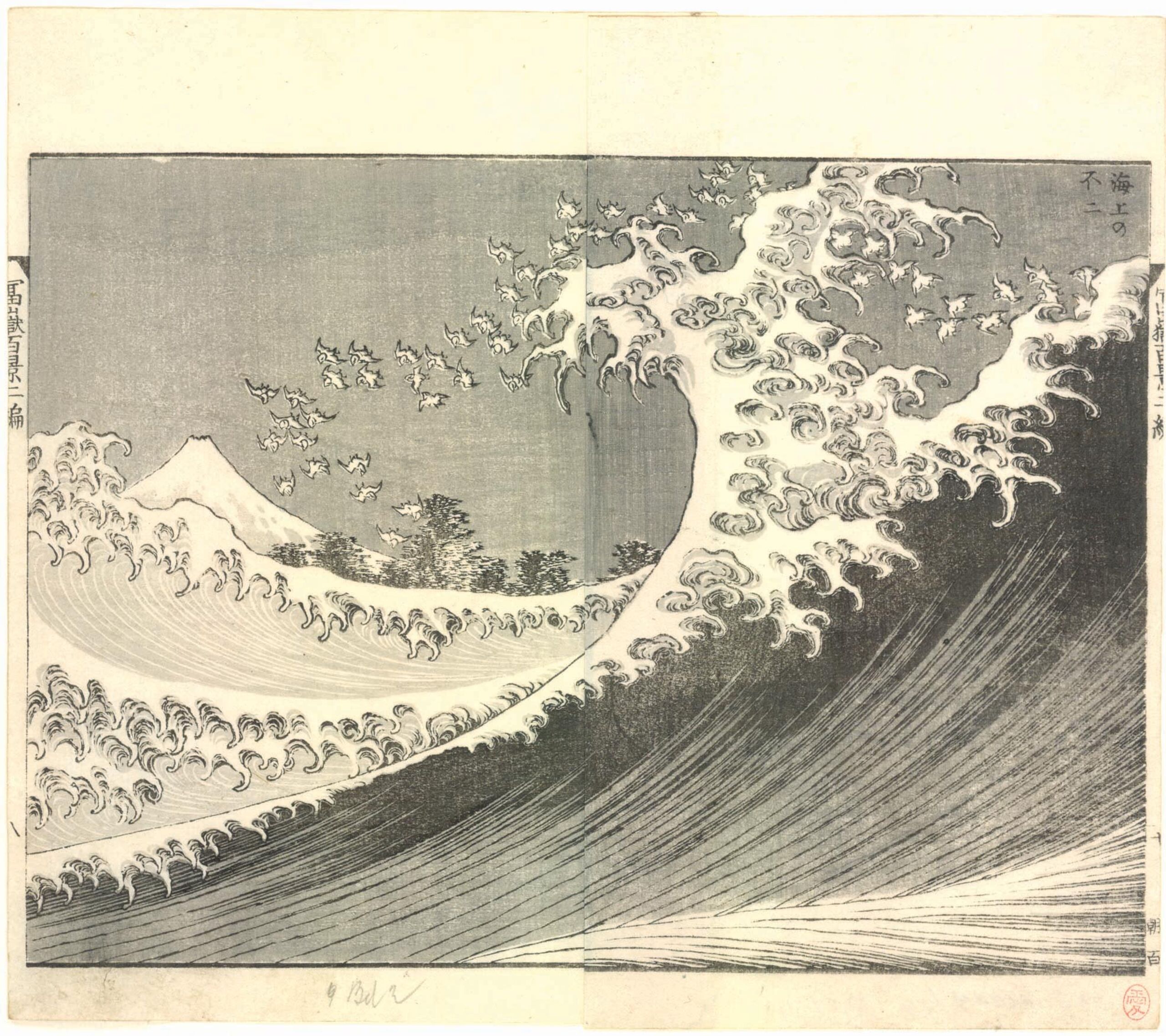 In diesem Bild prallen mehrere Wogen aufeinander, die die Betrachter sofort auf das Dramatischste in den großen Sturm hineinziehen. Dichte Schraffuren auf dunklem Grund führen den Blick diagonal in das Bild, die Schaumkronen brechen gerade in sich zusammen, aufgeregt hochfliegende Vögel lösen sich im dargestellten Moment aus ihnen heraus. Der Fuji zeigt sich im Hintergrund wie ein ferner Wellenberg.