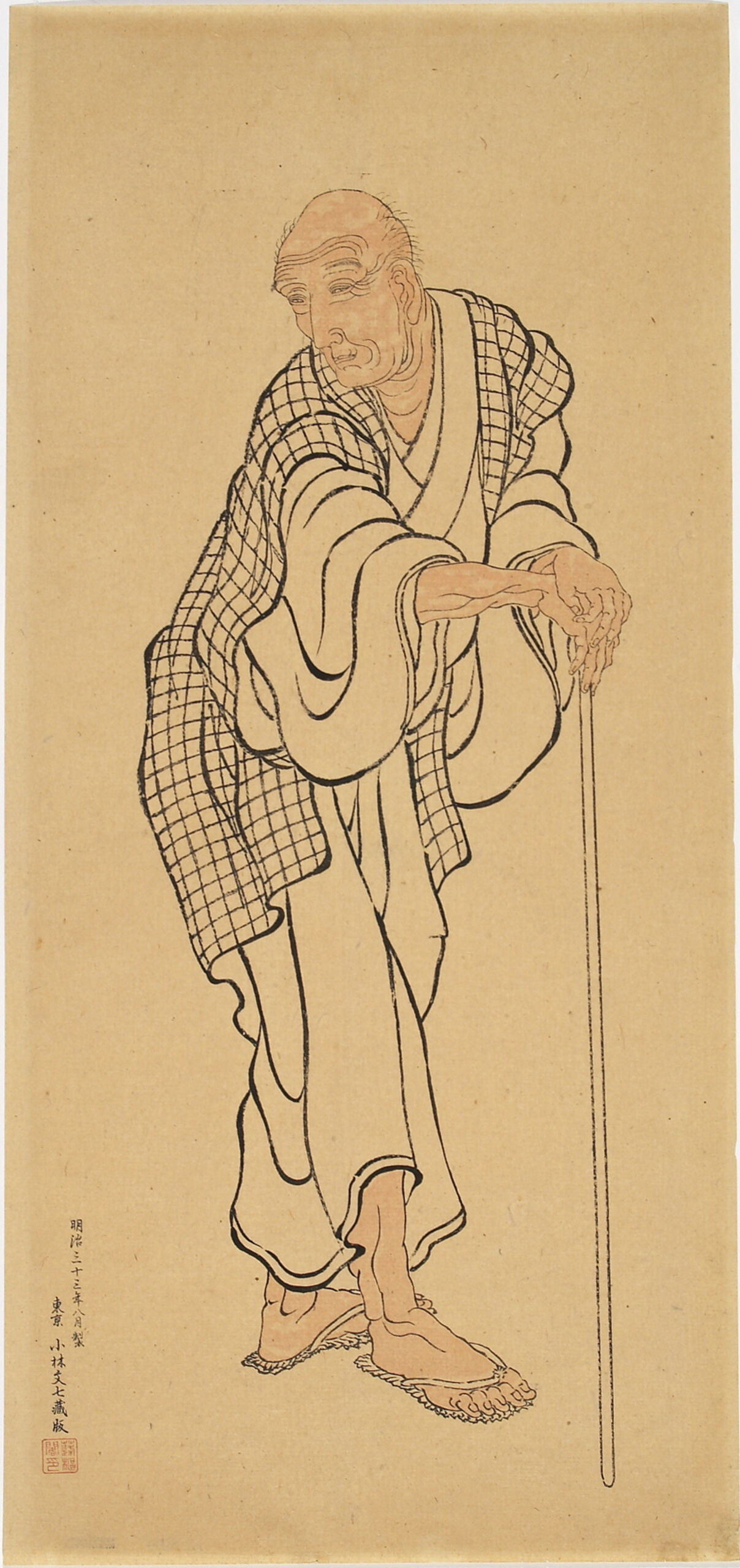 Angeblich ein Selbstporträt von Hokusai aus seinen späten Lebensjahren. Man kann davon ausgehen, dass es sich bei dem Druck hier um einen Nachschnitt von Kobayashi Bunshichi 小林文七 handelt. Ein ganz ähnlicher Druck (?) von Bunshichi mit unifarbener Jacke existiert im Musee Guimet (früher im Louvre). Zugleich ist dort auch ein Brief von 1901 erhalten, den Vever an den Louvre schrieb und der folgenden Satz enthält: “In October of 1900, when Mr. Kobayashi visited Paris, I received from him an engraving he had just recently completed of a self-portrait by Hokusai.” (vgl. Lit. Guimet).