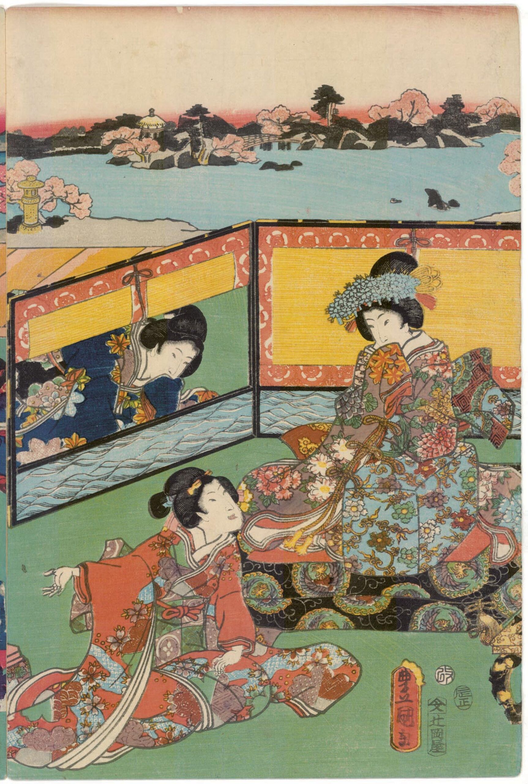 Ein Fest im Blumenpalast. Anspielung auf Genji 源氏/Mitsuuji 光氏? Eine vornehm gekleidete Frau sitzt auf zwei übereinander gelegten zabuton (Sitzkissen) und hat ihren Arm auf einem festen Polster gelegt. Vor ihr eine Hofdame, eine weitere späht durch den hochgezogenen Vorhang des Stellschirms. Im Hintergrund ein Garten mit einer Teichanlage.