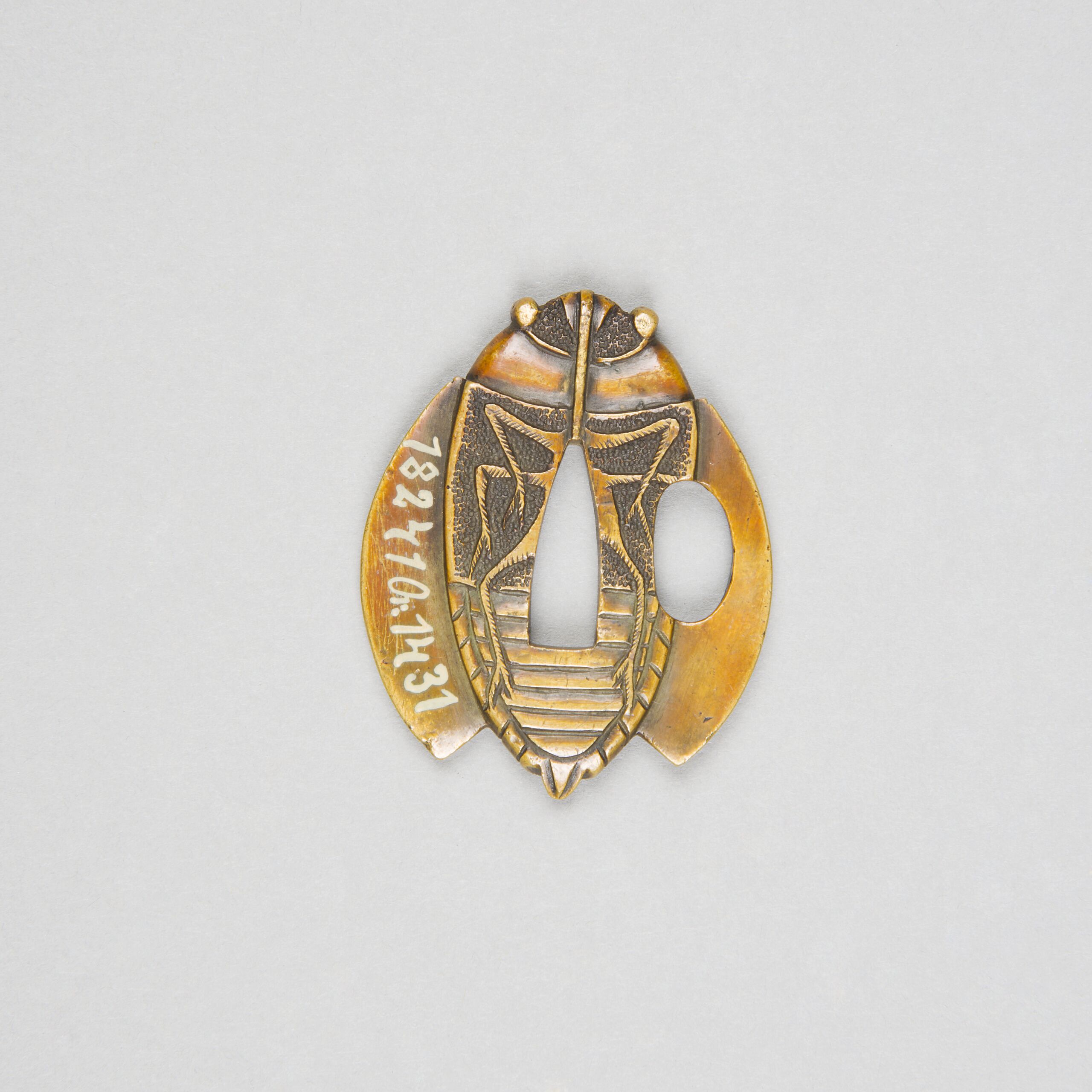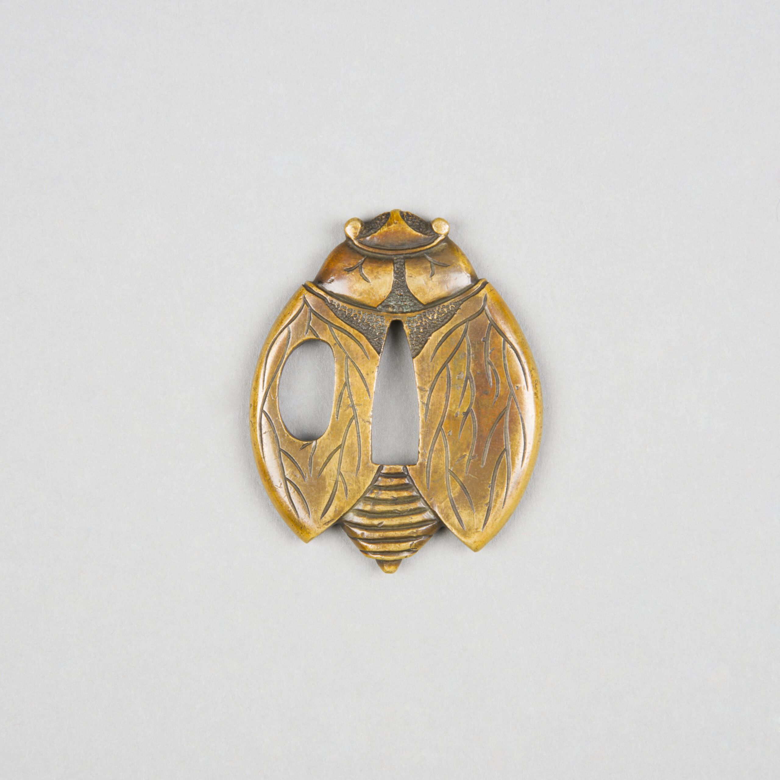 Form: zikadenförmig; links neben der länglichen Öffnung in der Mitte (nakagoana 中心穴 oder茎穴) die Öffnung kozukahitsu 小柄櫃.