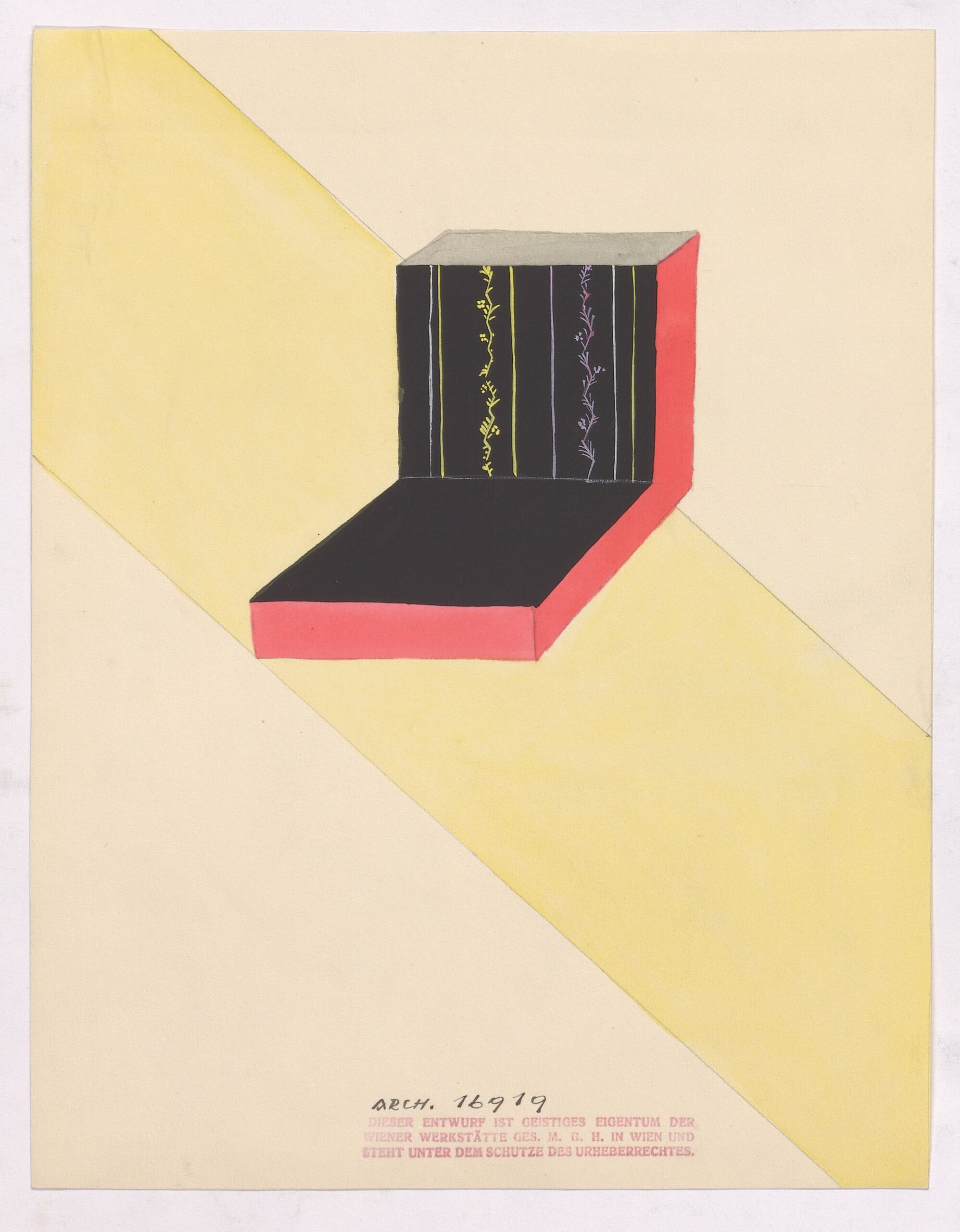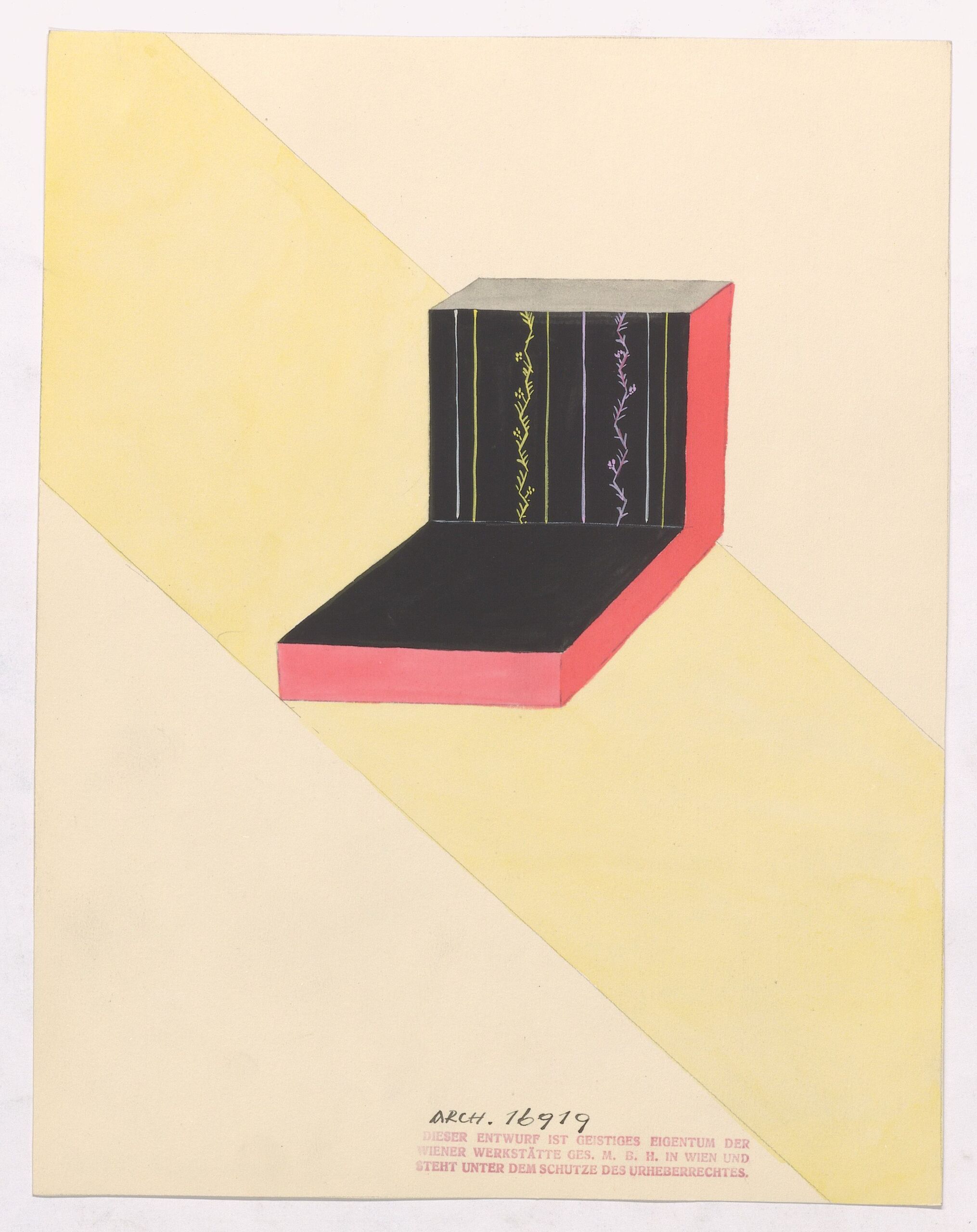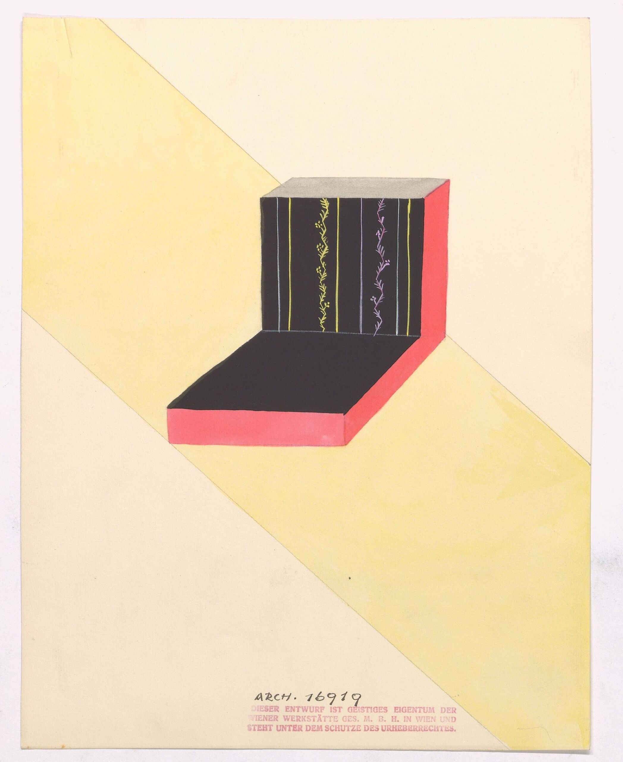 final artwork, 2 Polster (?), sitz- bzw. bankartig geformt, schwarz, gelb, grün, Wiener Werkstätte, MAK Inv.nr. WWSP 1685