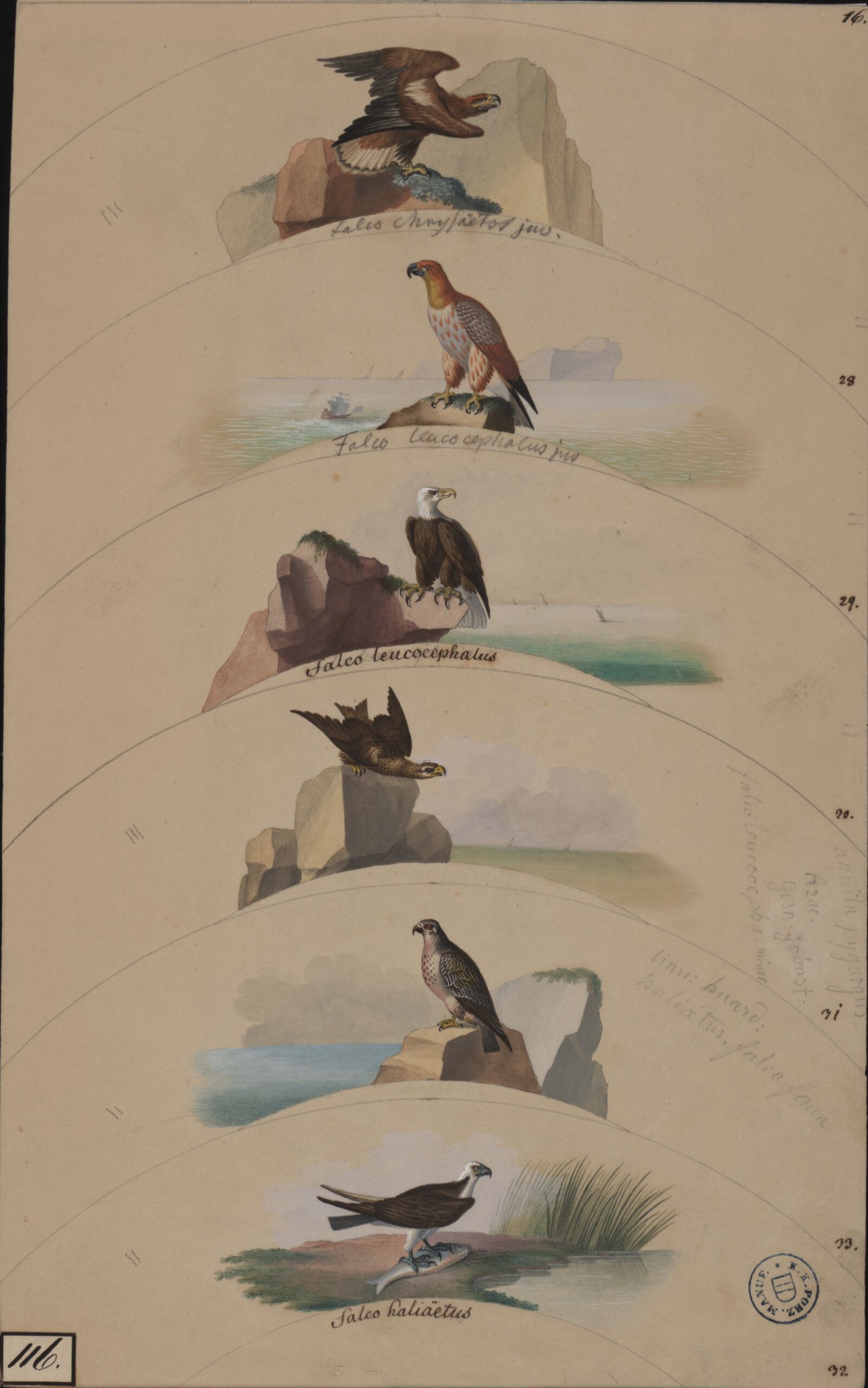 - 作品に記載されている文章: 16. / Falco chrysaetos juo. 28 / Falco Leucocephalus juo 29. / Falco Leucocephalus30. / Aquila pygryus [...] 31 / [...] falco 33. /Falco leucocephalus minor Falco haliaetus 32