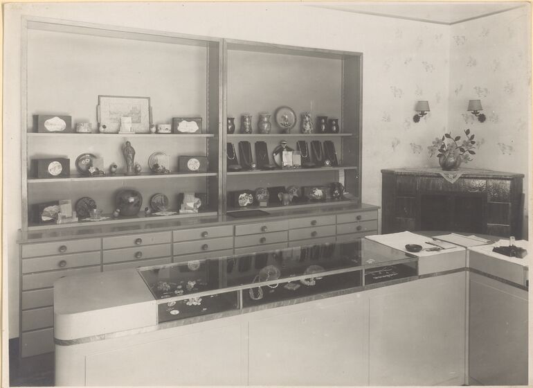 - photograph, Fotografie einer Auslagengestaltung mit einem Wandschirm mit dekorativem Gitter, vermutlich ausgeführt von der Firma Hrachowina, von 1929-1950